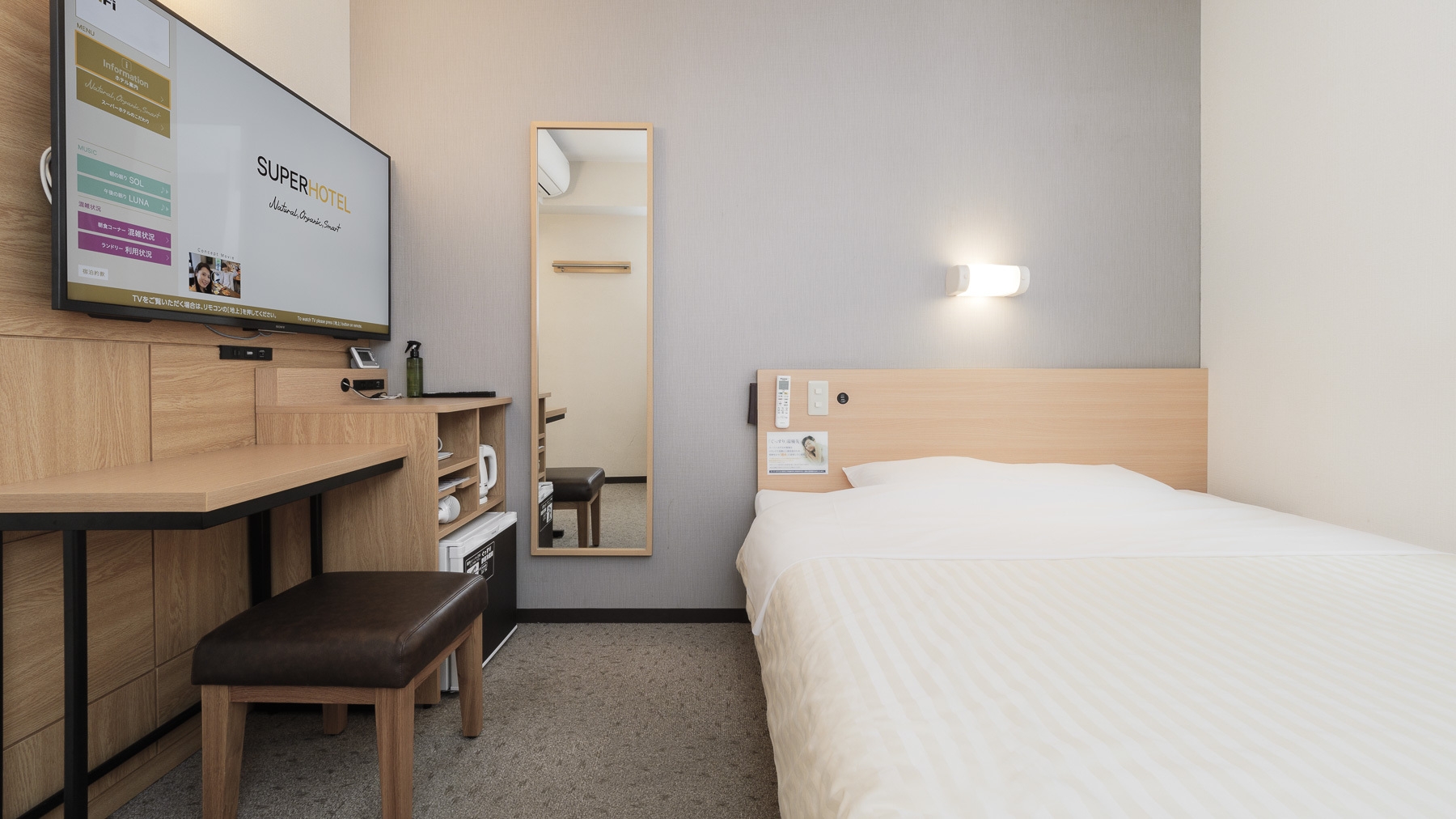 スーパーホテルで最もスタンダードなお部屋である【スタンダードルーム】です。 140cm幅のダブルサイズのワイドベッドでぐっすりお休み下さい。