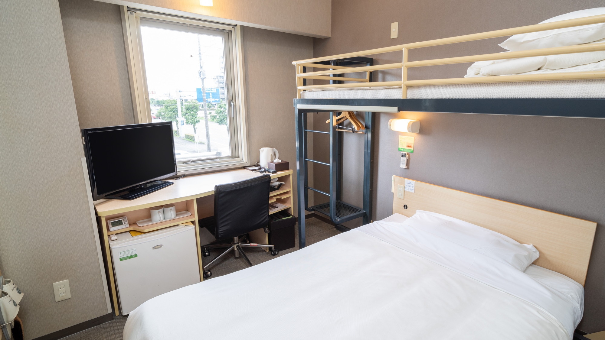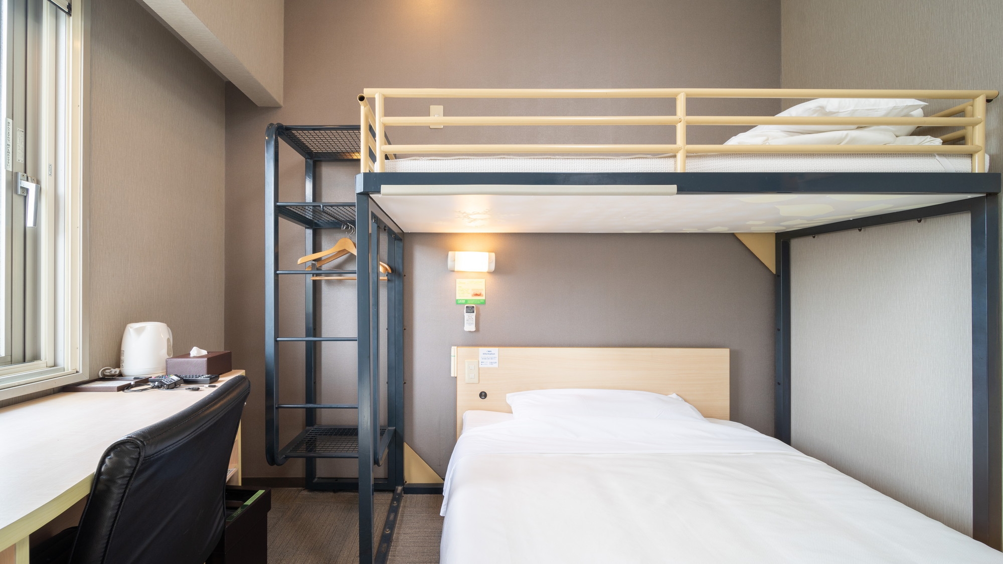 ダブルサイズのワイドベッドとお子様に人気のロフトベッド付の【スーパールーム】です。 ご家族にお勧めです。