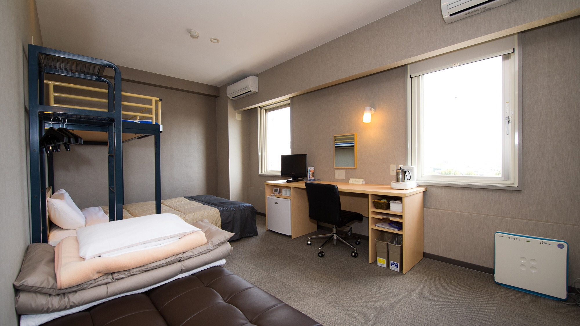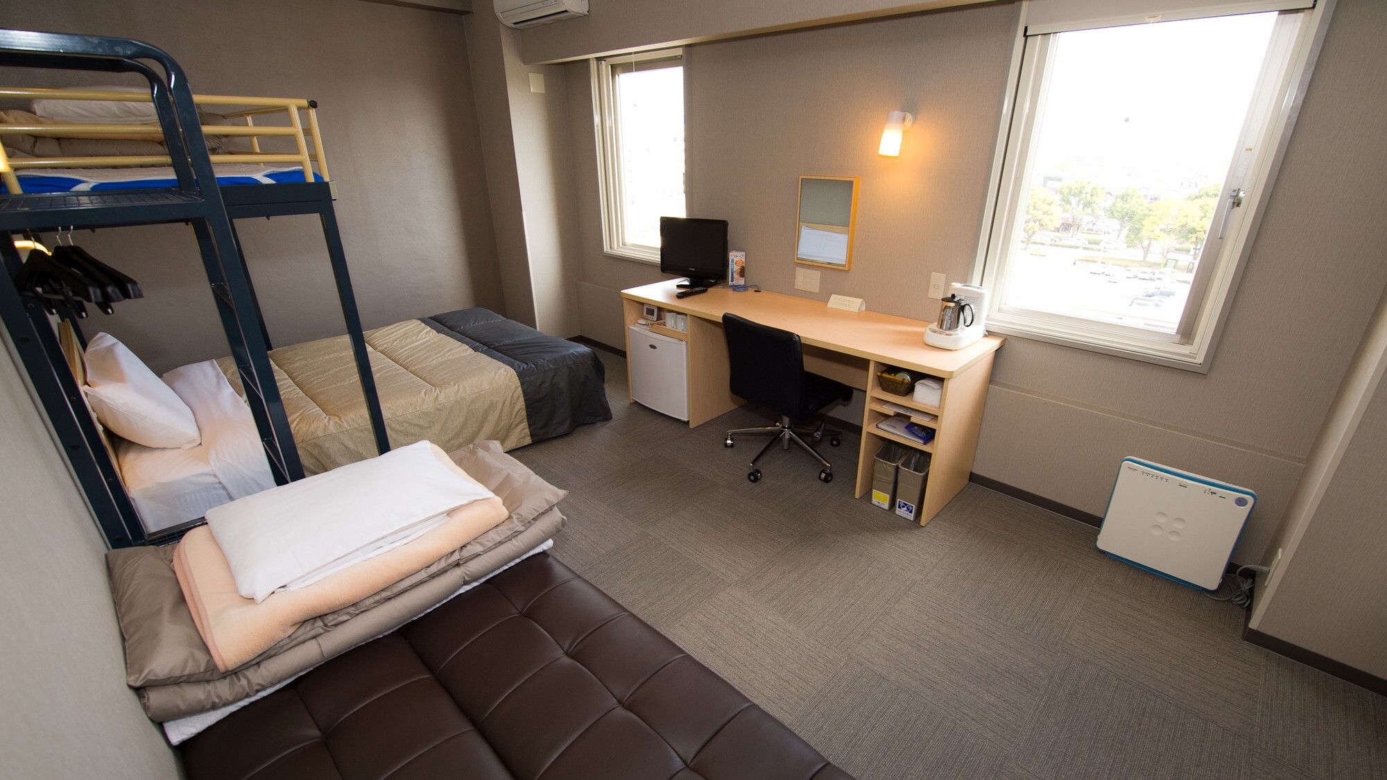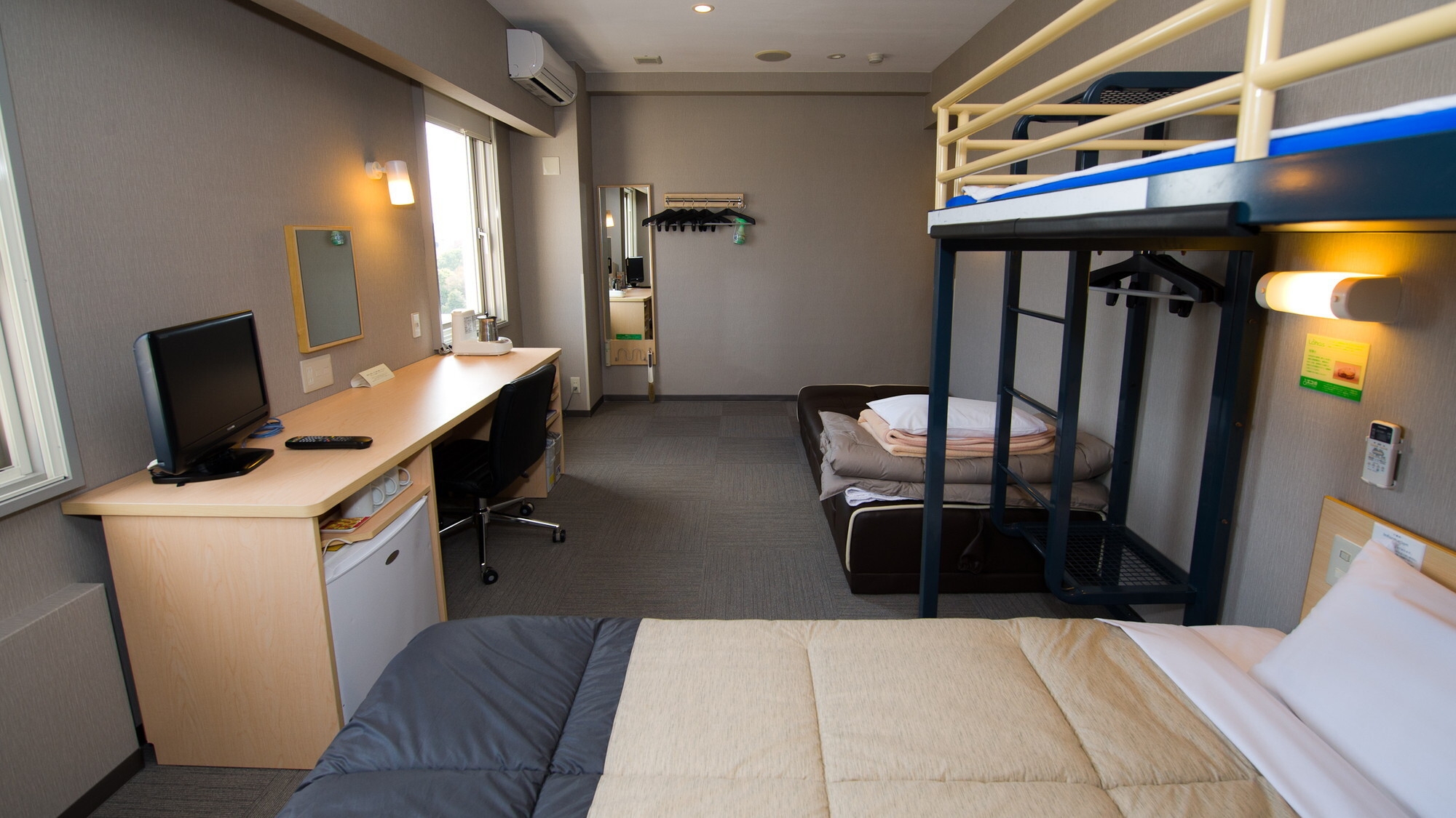 定員3〜4名までお泊り頂ける【トリプルルーム】です。 ダブルベッド、ロフトベッド、ソファベッドの3台のベッドがあるお部屋で、ご家族などにお勧めです。