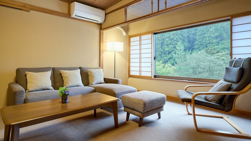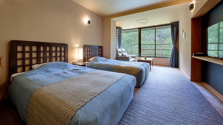 2024年5月にリニューアルした洋室(ツイン)の源泉かけ流し半露天風呂付客室にご案内します。