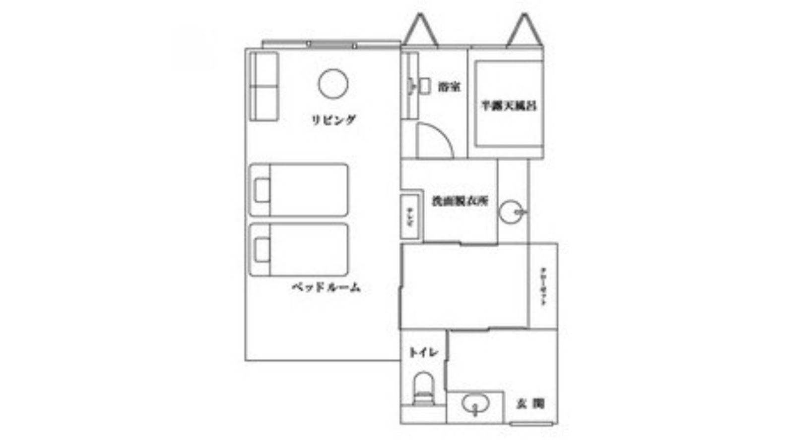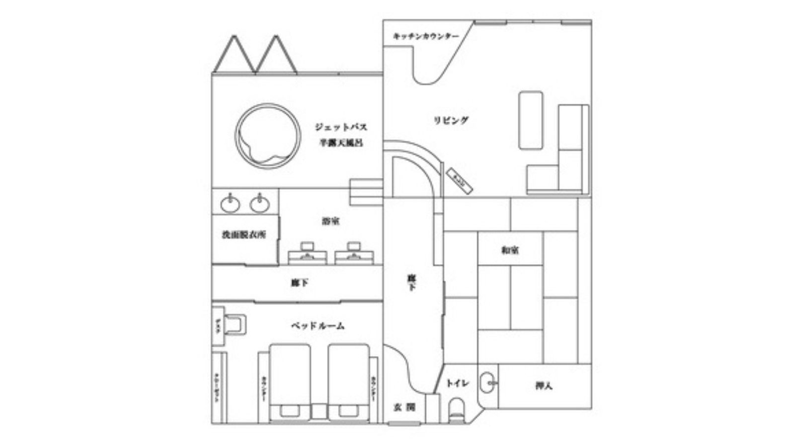 リビング+寝室(和ベッド)+半露天風呂。3名以上の場合エキストラベッド用意