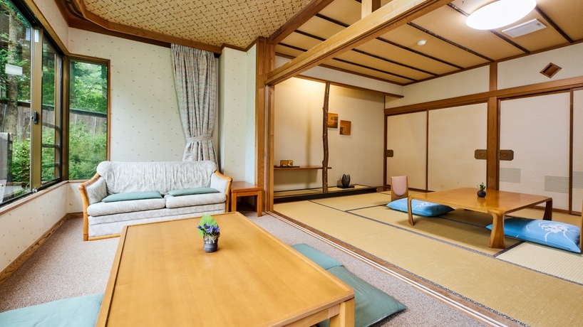 谷川岳眺望のゆったりとした和室10畳に堀り炬燵(こたつ・4.5畳)を備えたお部屋にご案内します。(40平米・禁煙)