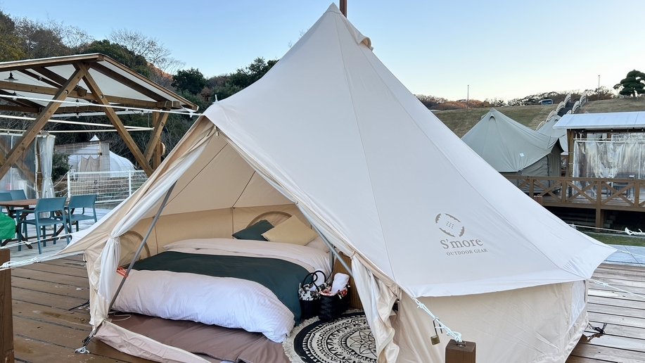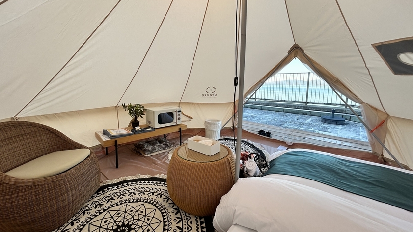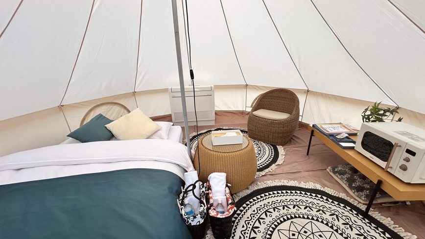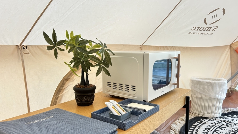 ご夫婦やカップルでご利用のお客様におすすめ!ダブルベッド1台でテント内でゆったりとご利用いただけます★グランピングテント内で唯一、電子レンジをテント内に設置!
