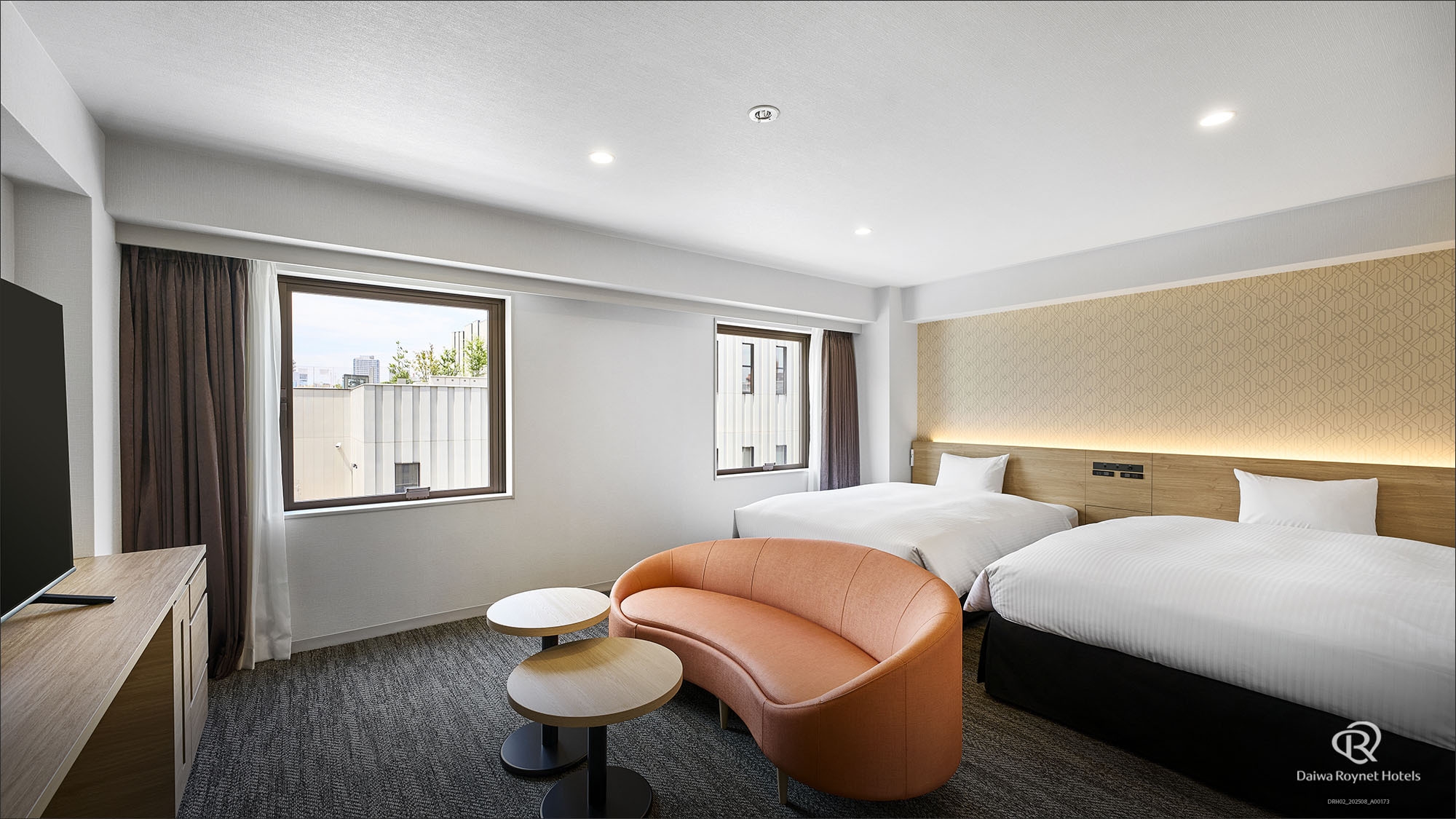 ベッド幅122cm、3台のうち1台はエクストラベッド(幅狭)・加湿空気清浄機・スボンプレッサー・消臭剤・全室無線LAN(Wi-Fi規格)&有線LAN無料接続可