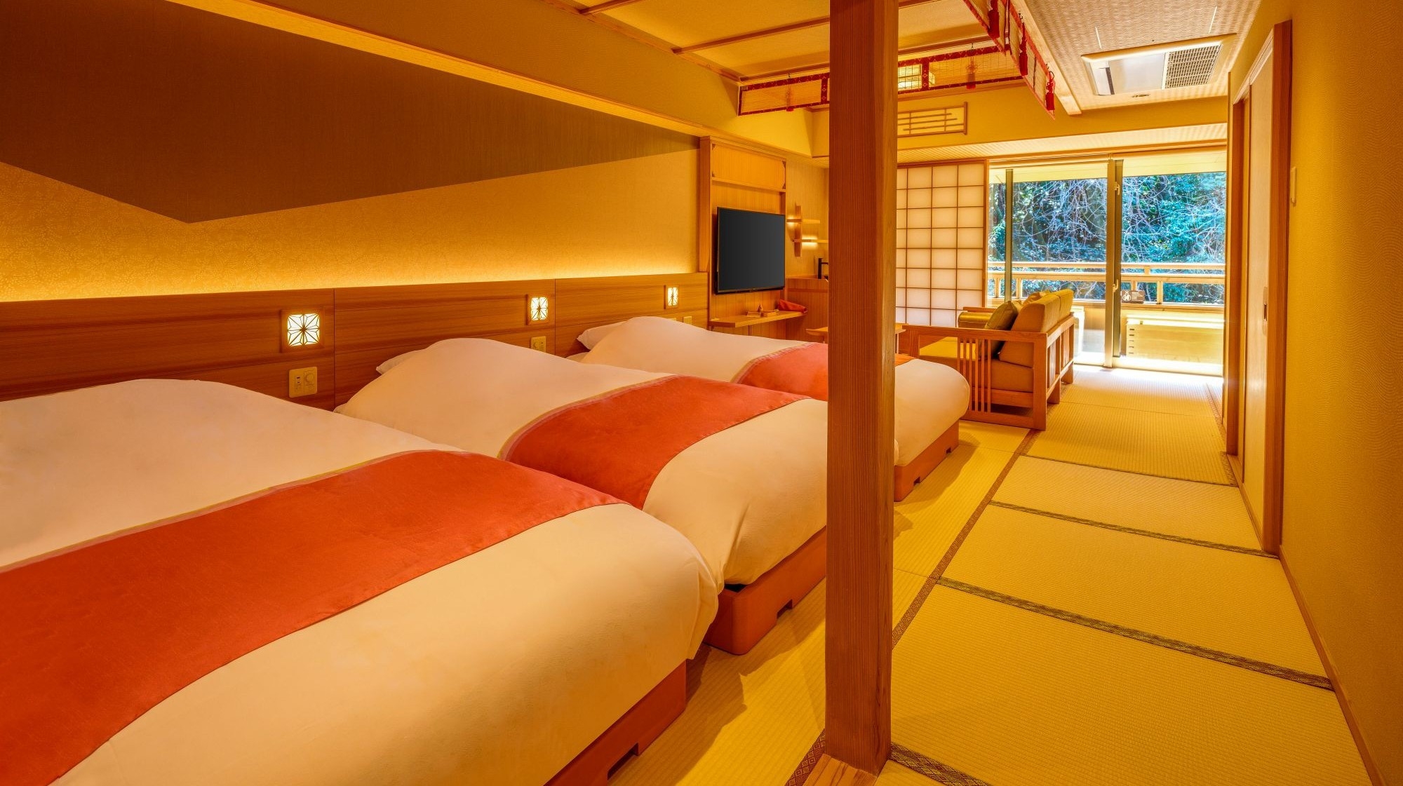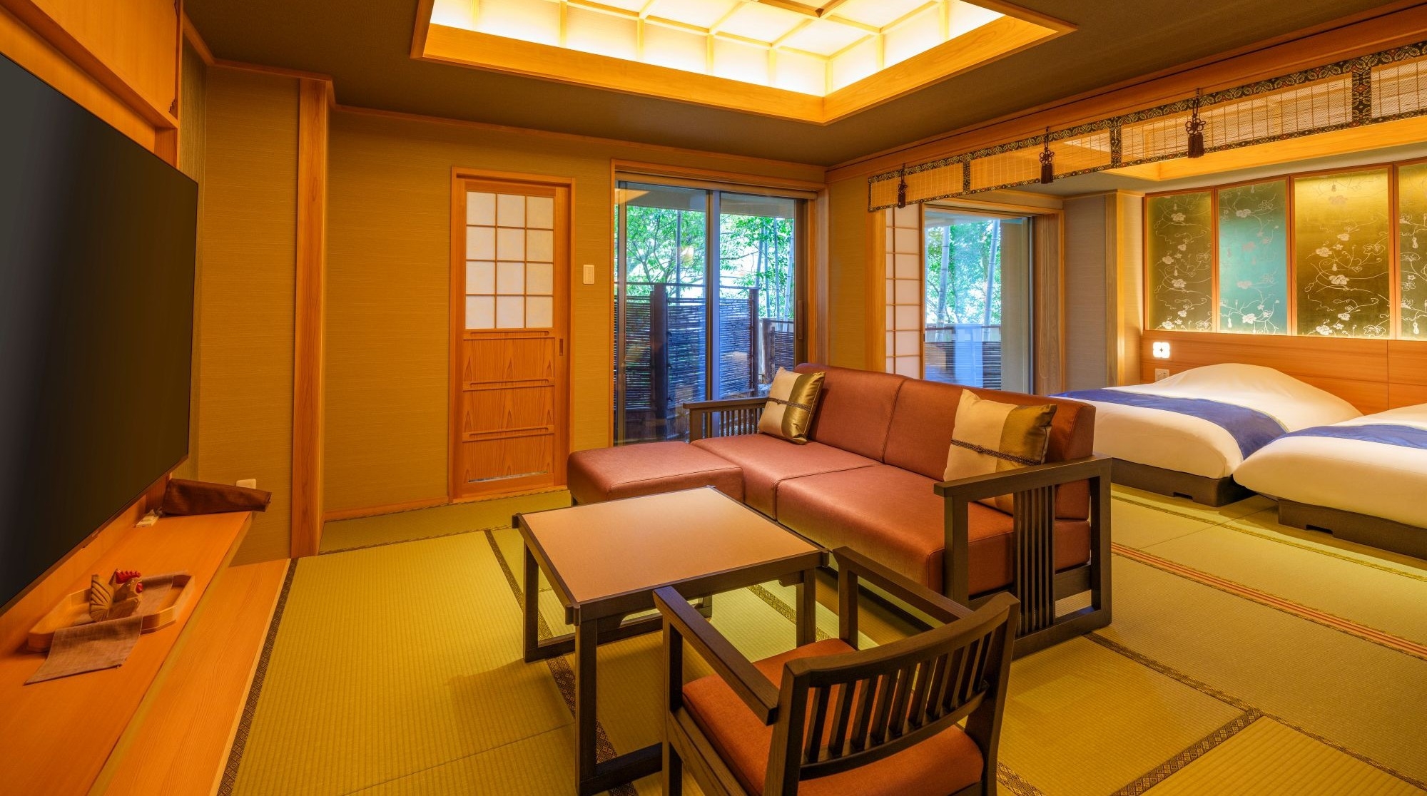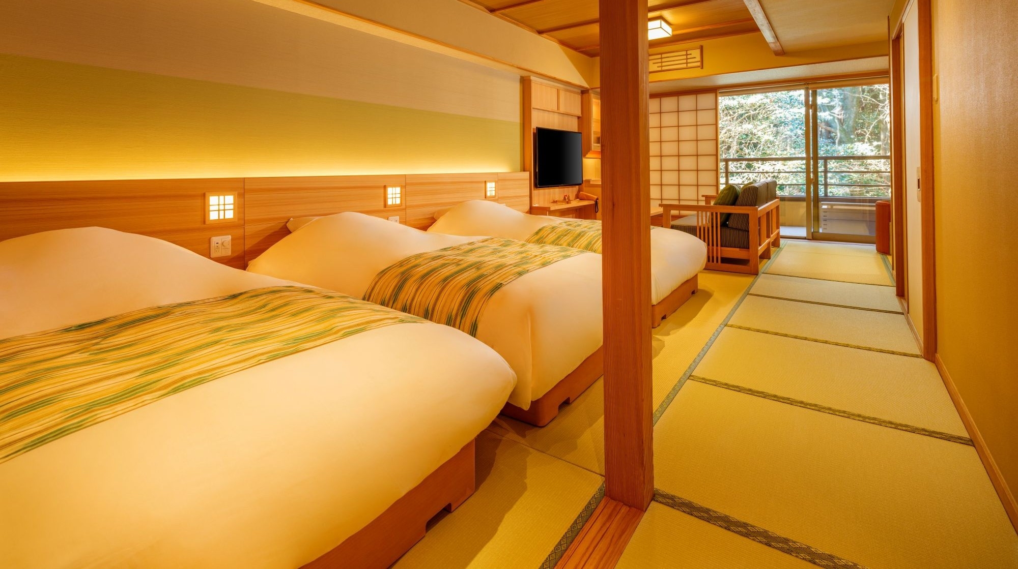 和風の宿では珍しい、畳敷きのお部屋に和ベッド3台を配置し、寛ぎスペースもゆったり確保。設えが其処かしこに施されたお部屋です。