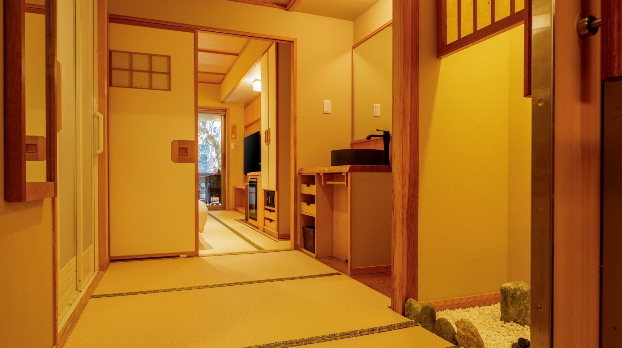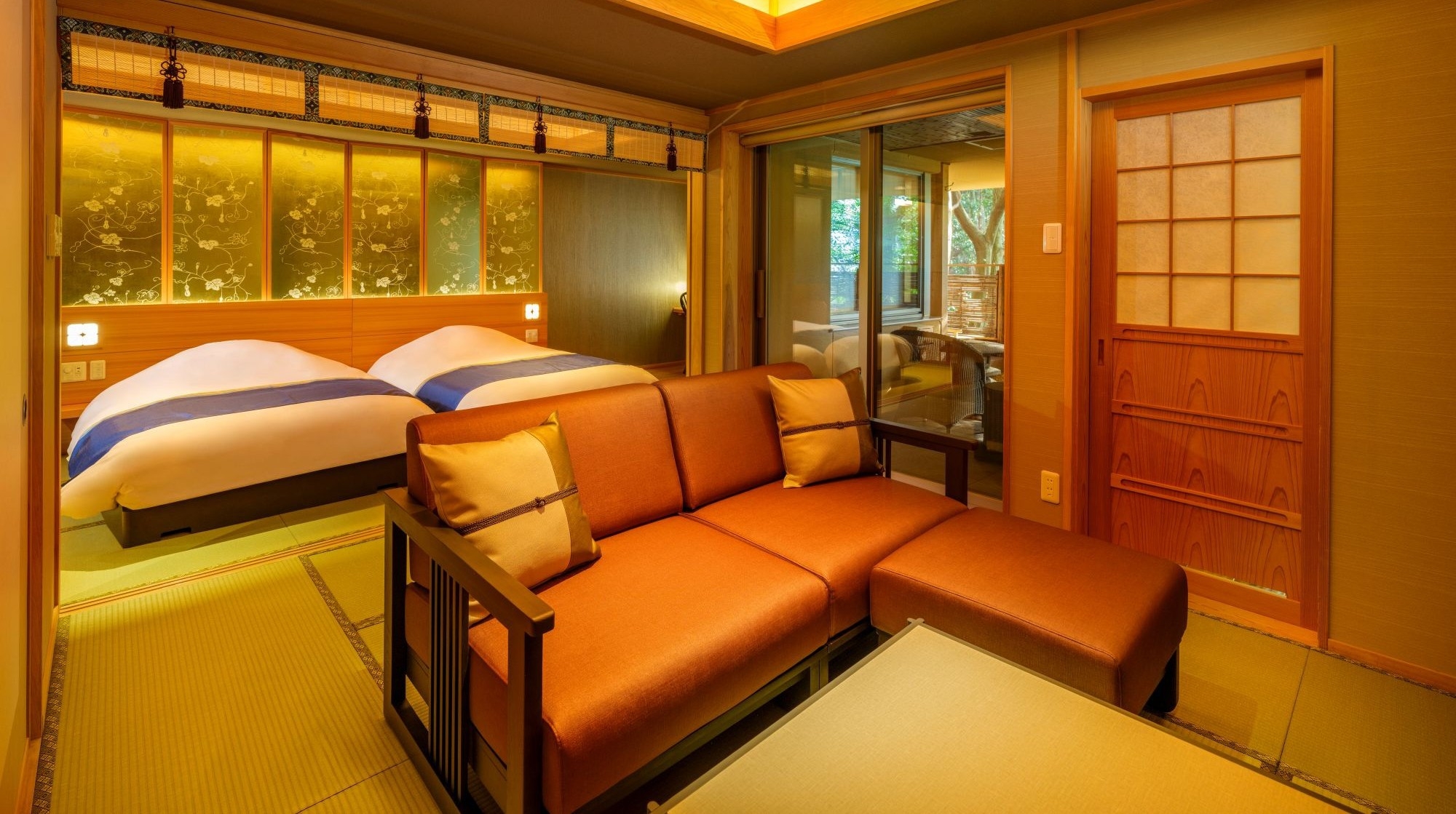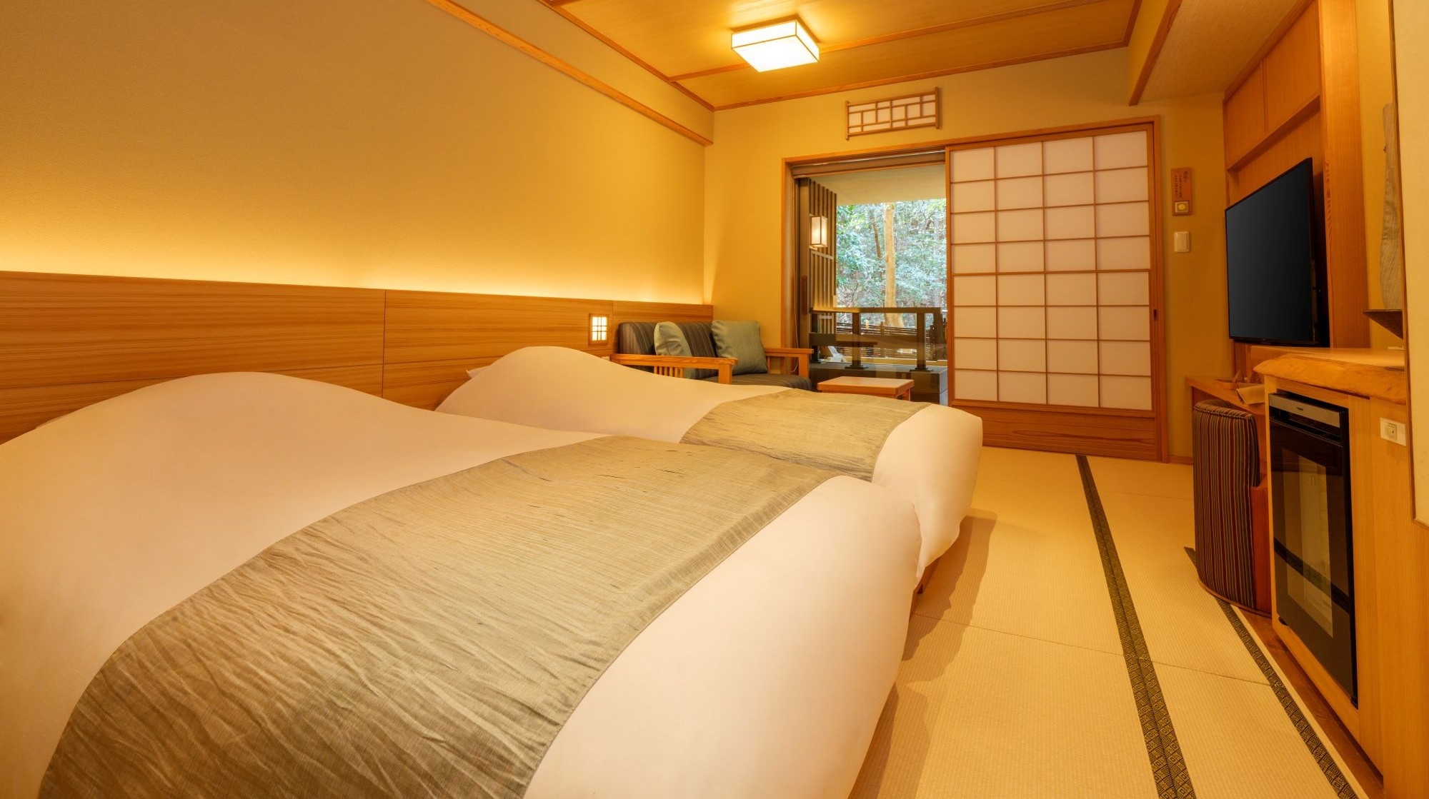 ツインのベッドルームと広い和室が繋がった、寛ぐスペースが最も広いお部屋です。足湯付きです。1F専用ドリンクスペースを無料でご利用可