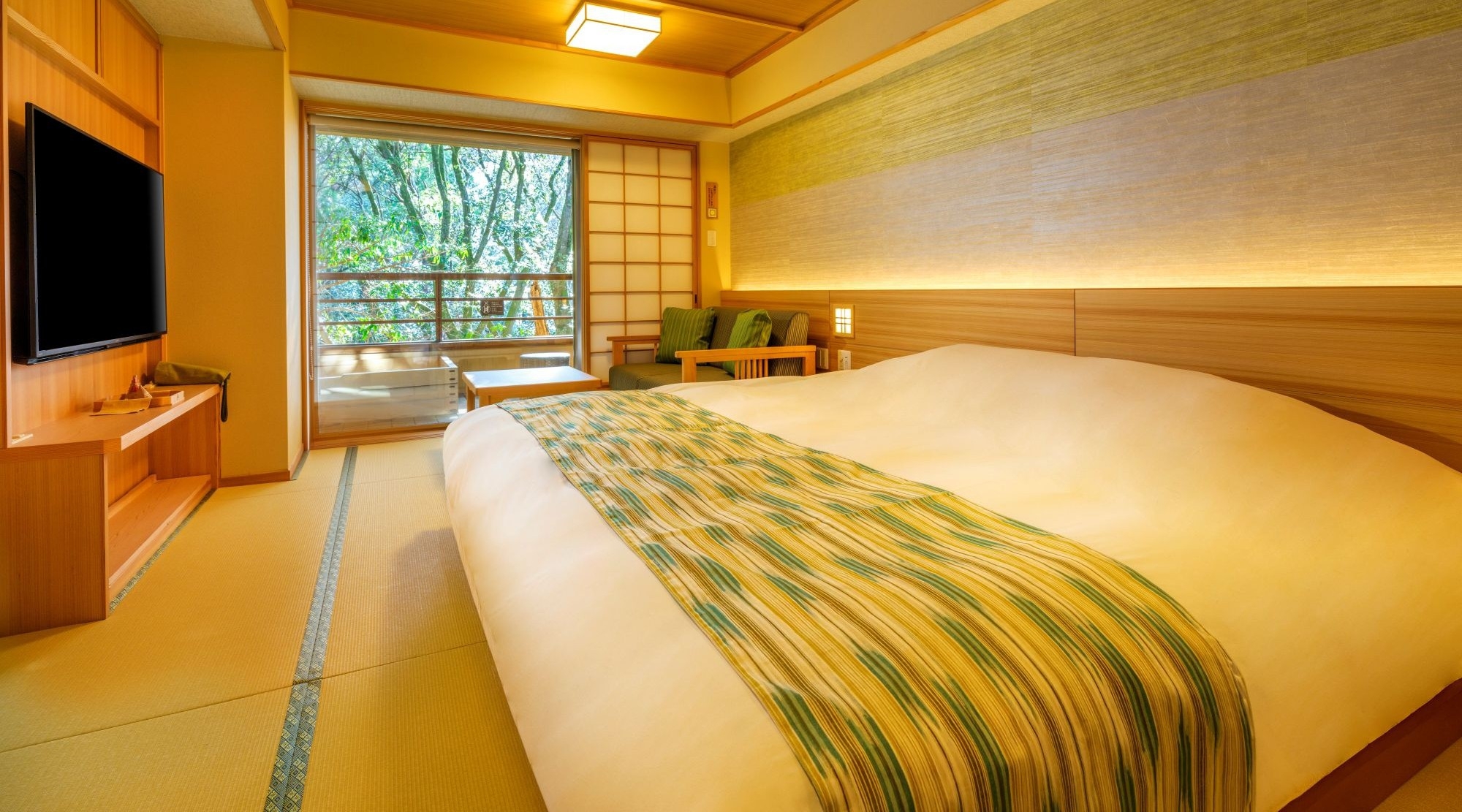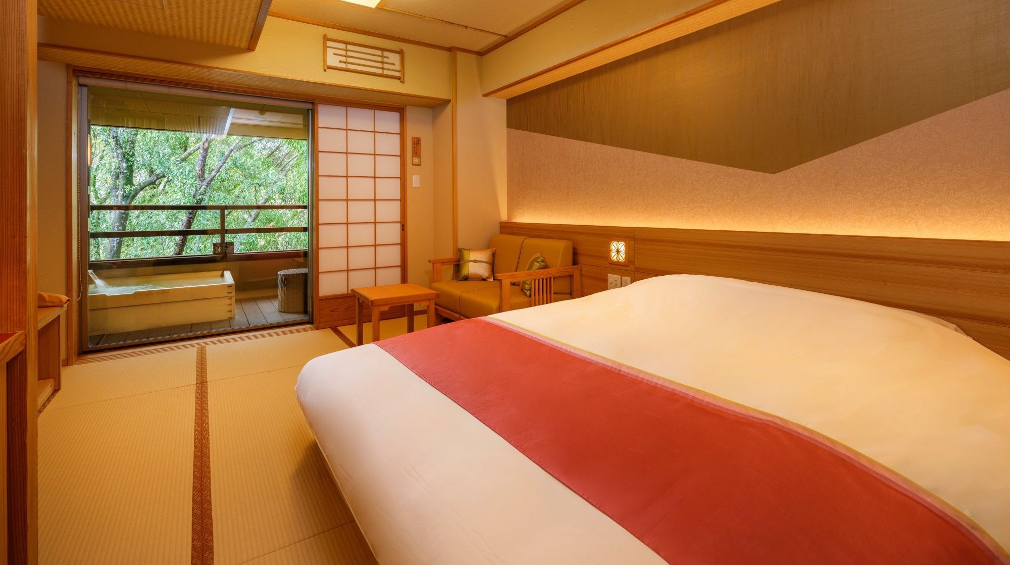 畳敷きにキングサイズの和ベッド。癒しの杜を間近に臨む露天風呂付。客室露天は温泉ではありませんが、森林浴をしながらの湯あみは伊久ならでは。ちょっと贅沢な二人旅を。