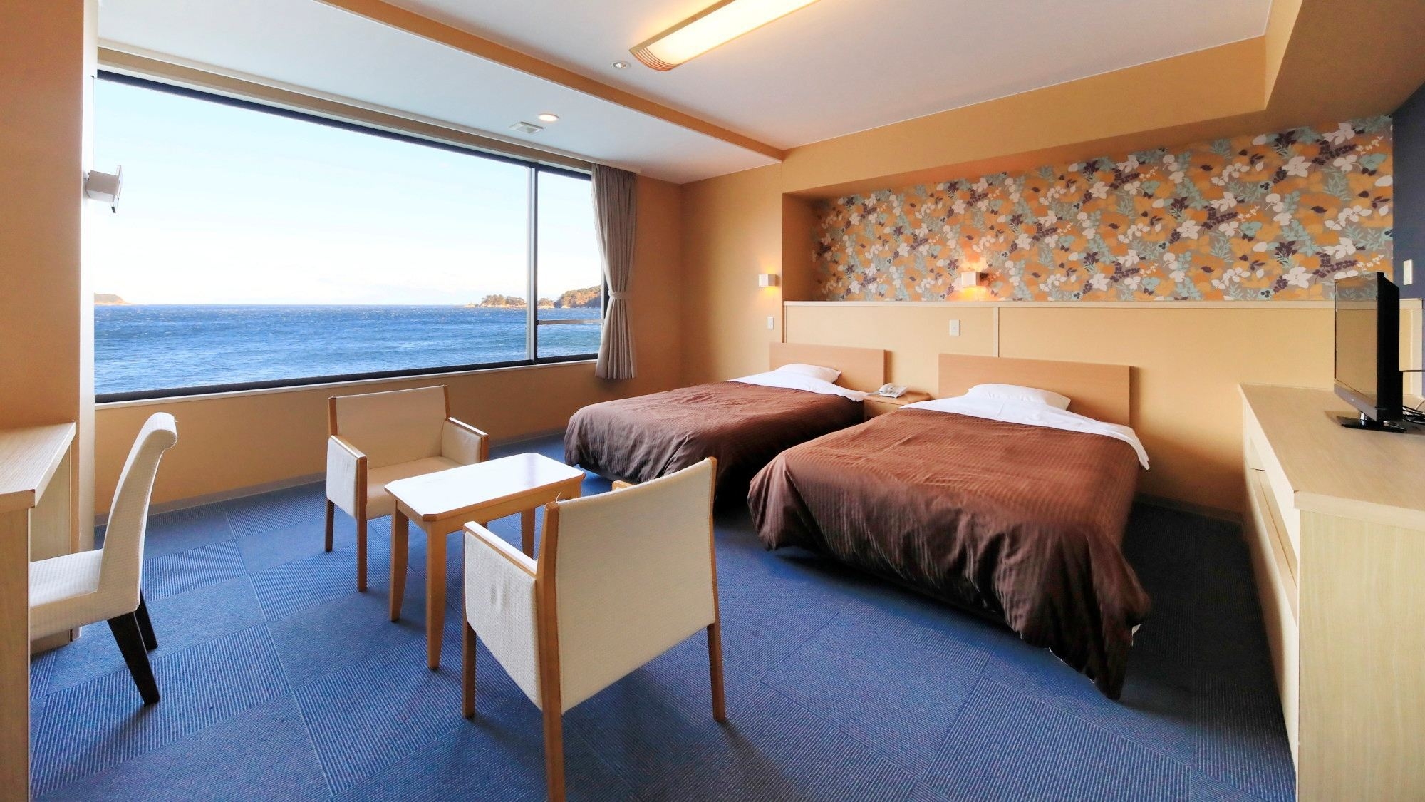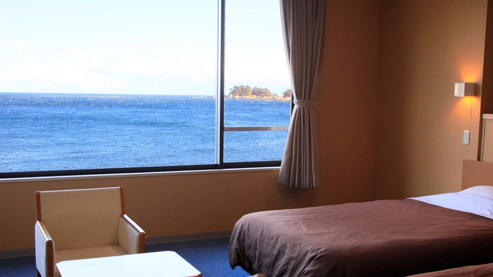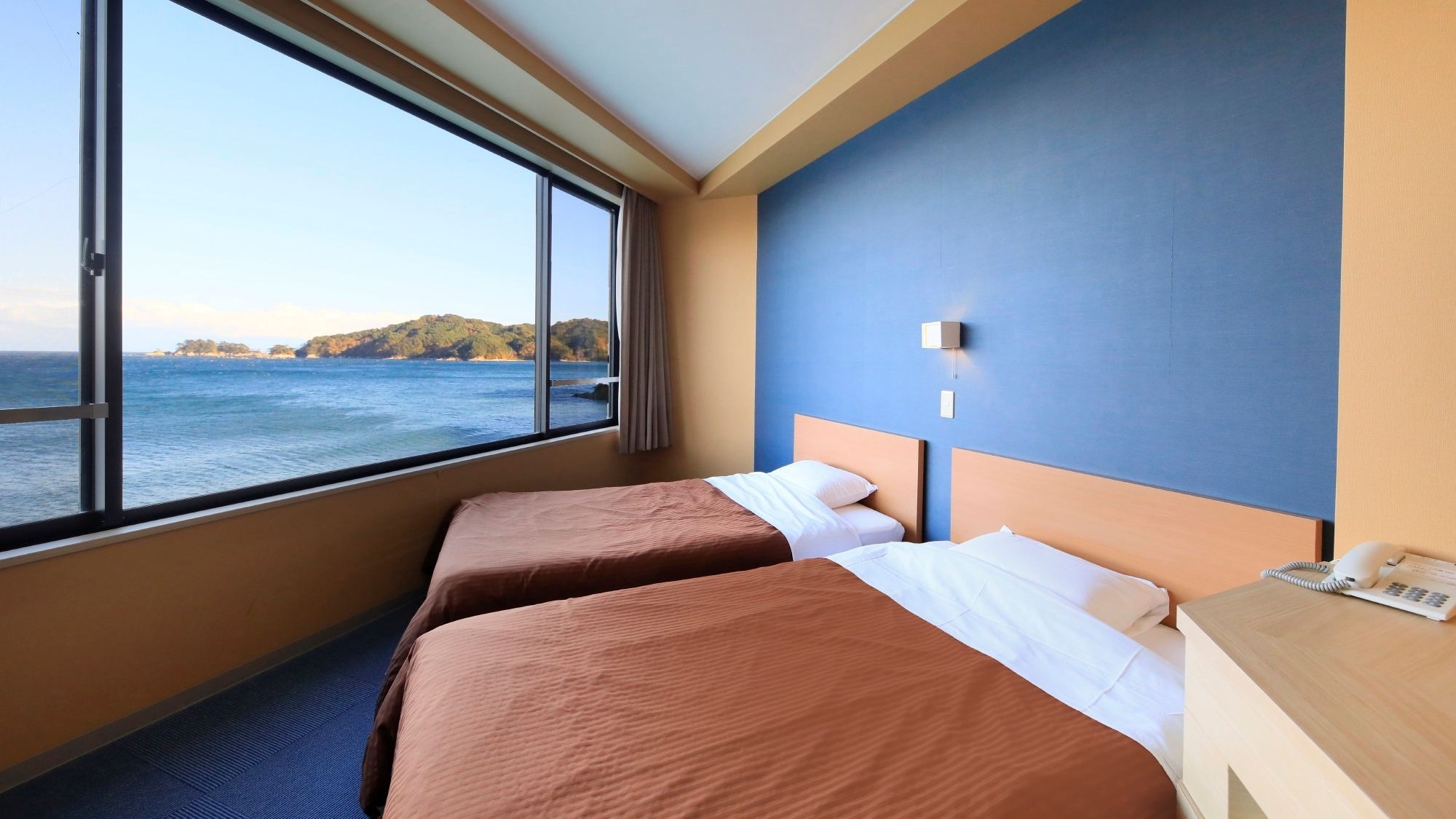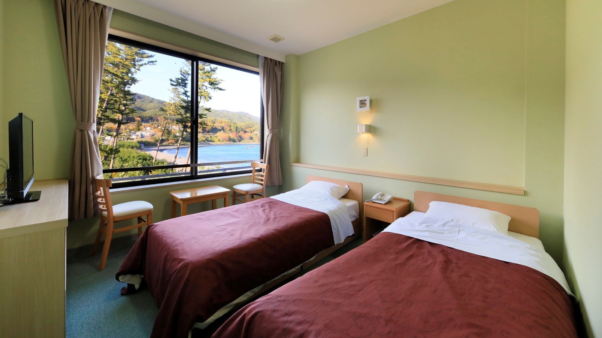 バス・トイレ付きのツインルームです。ホテル北側の松林に向いたお部屋で、斜め右手に浪板海岸・船越湾が広がります。
