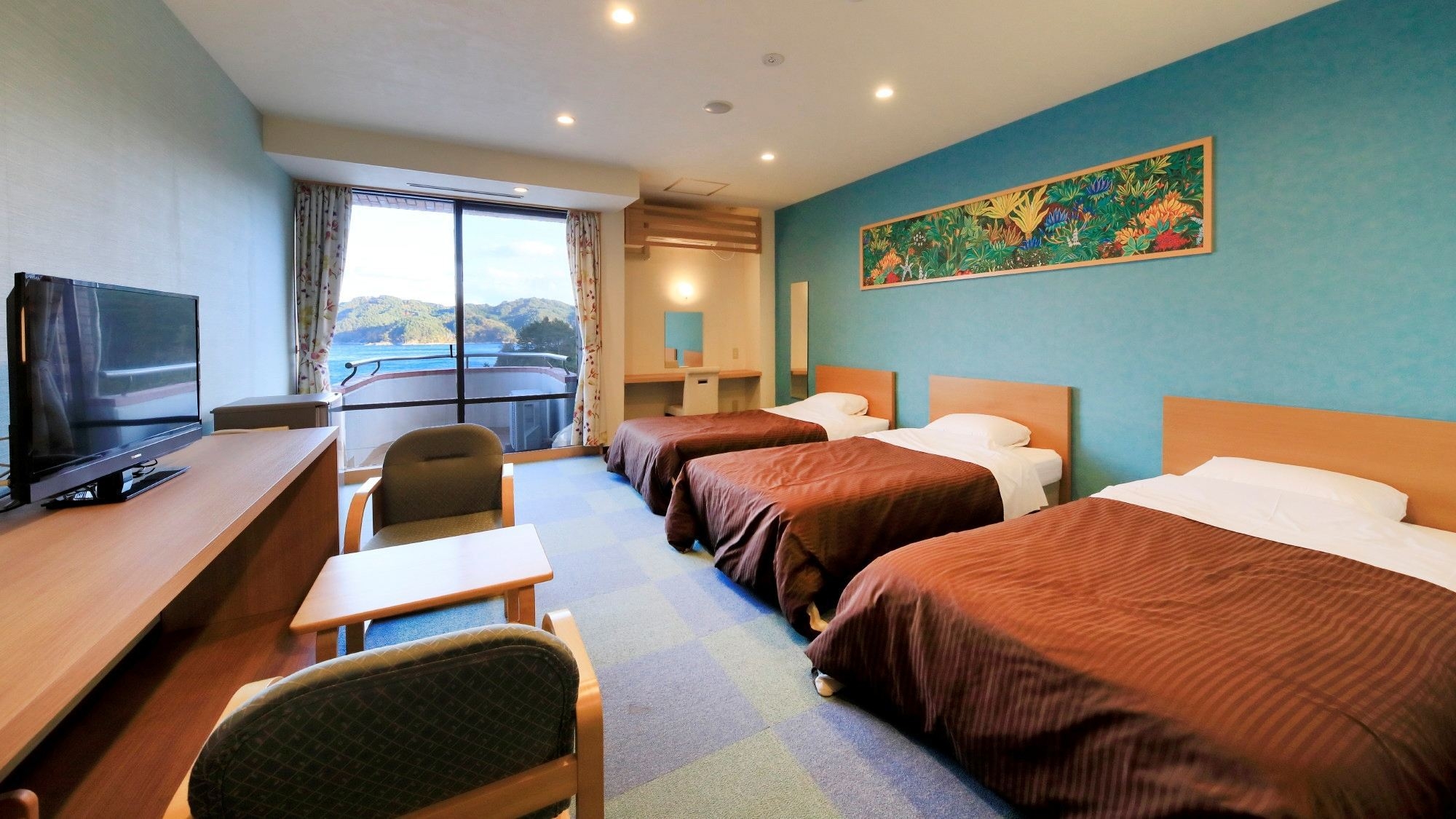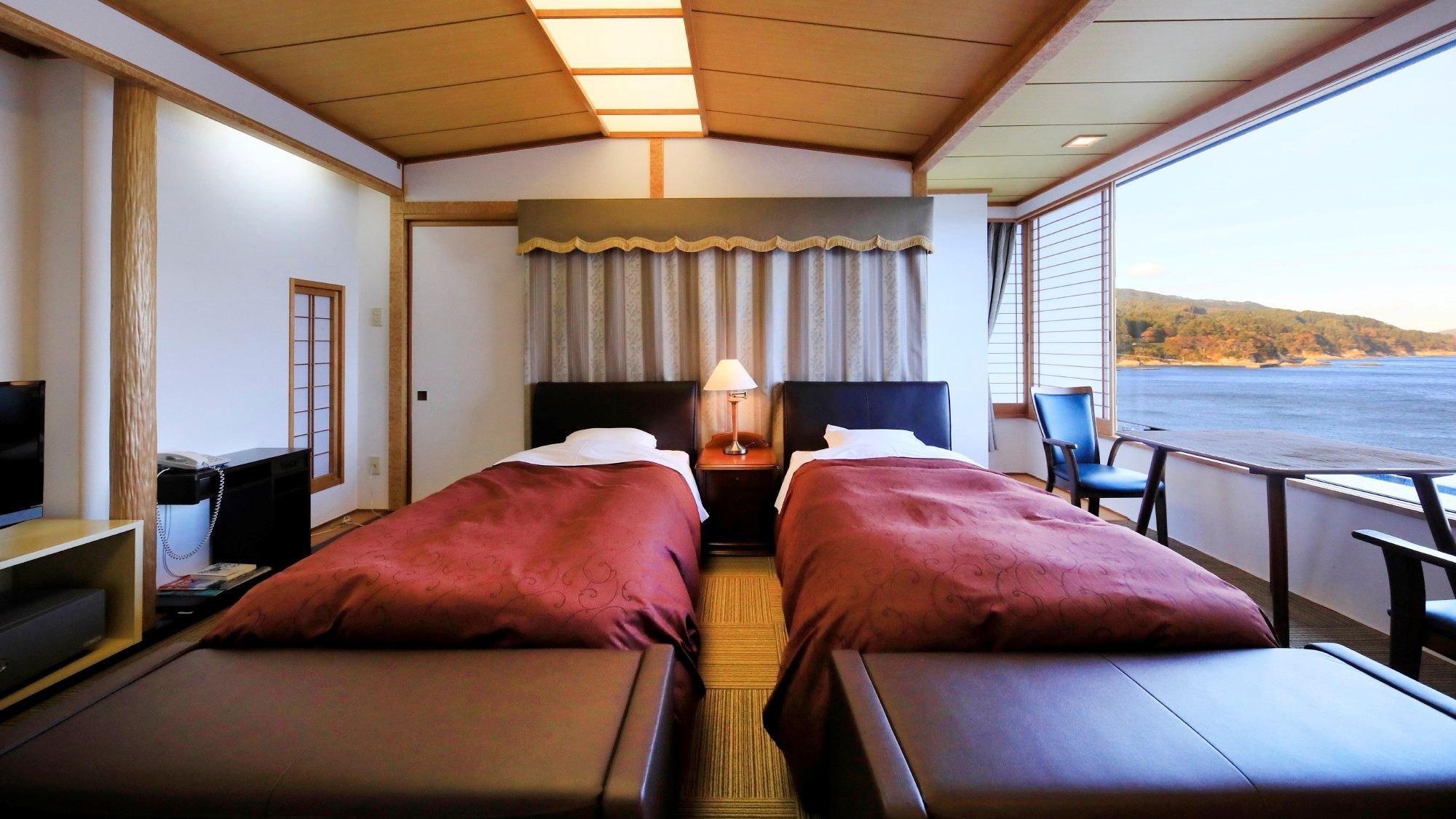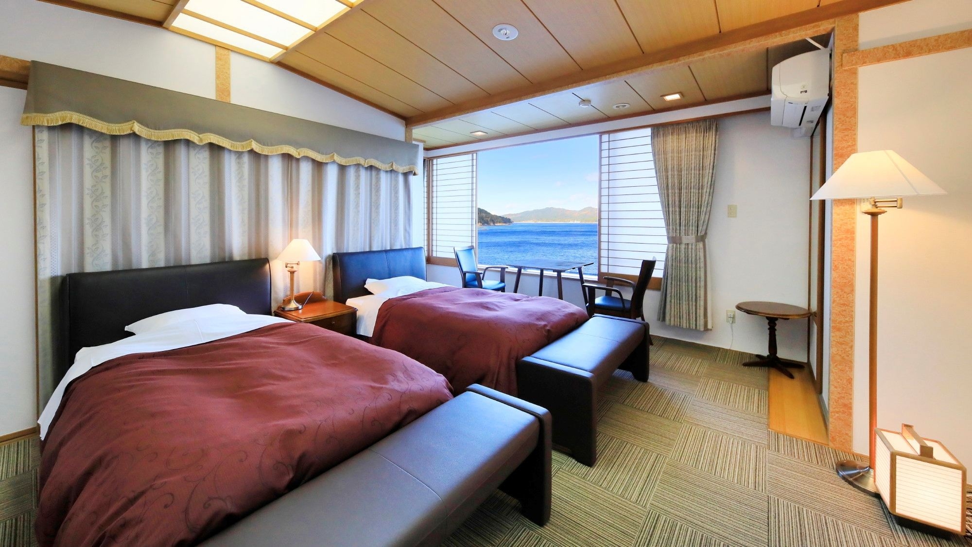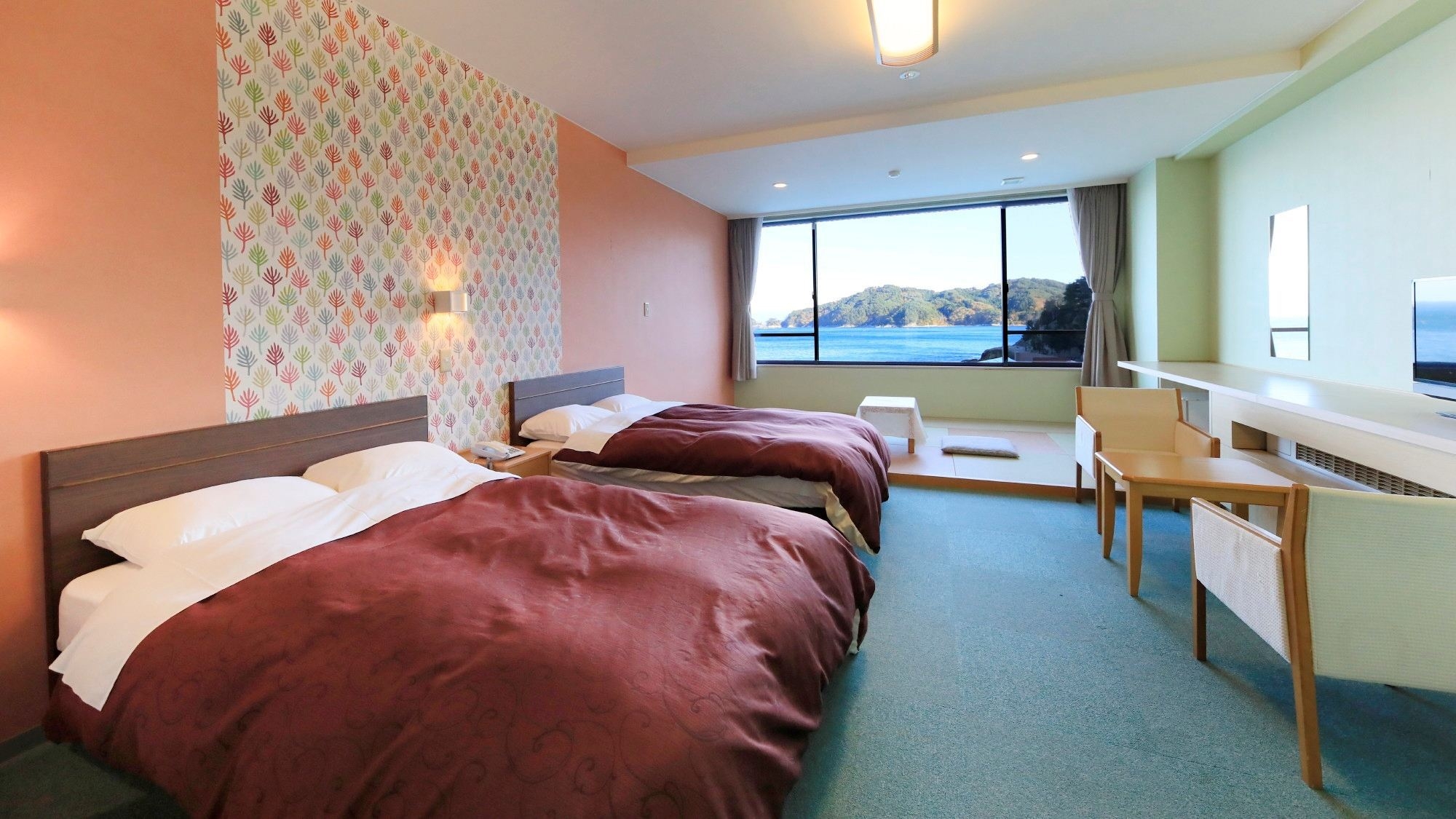 バス・トイレ付きのツインルームです。ホテル北側の松林に向いたお部屋で、斜め右手に浪板海岸・船越湾が広がります。
