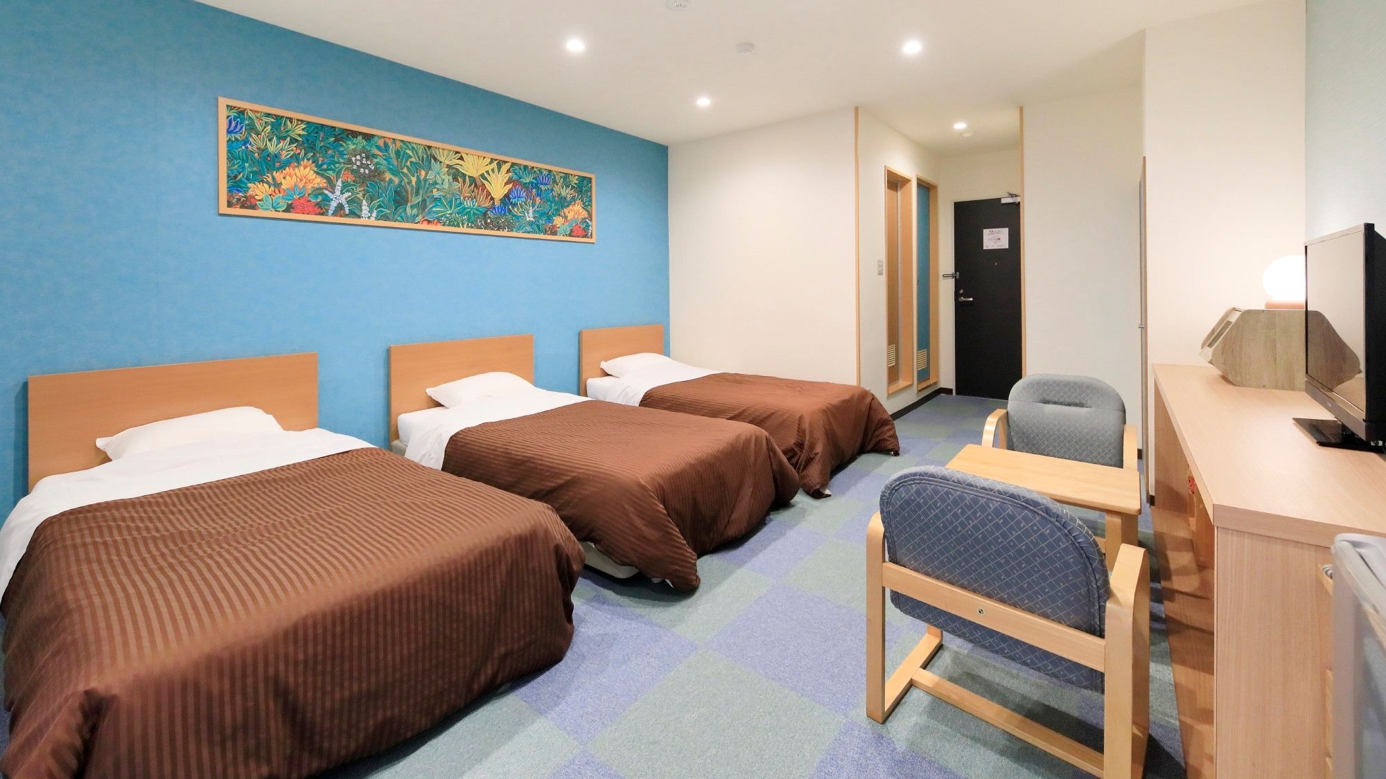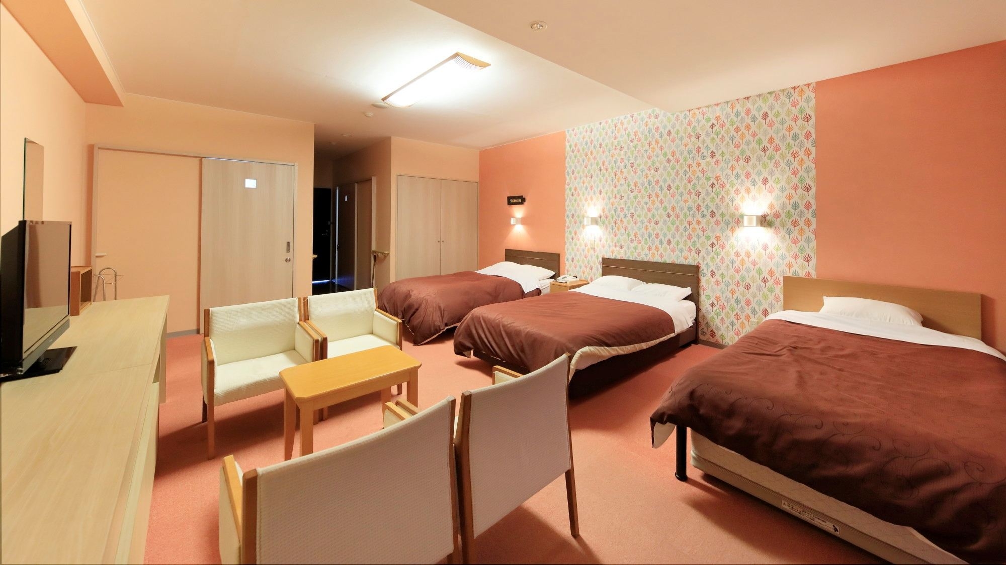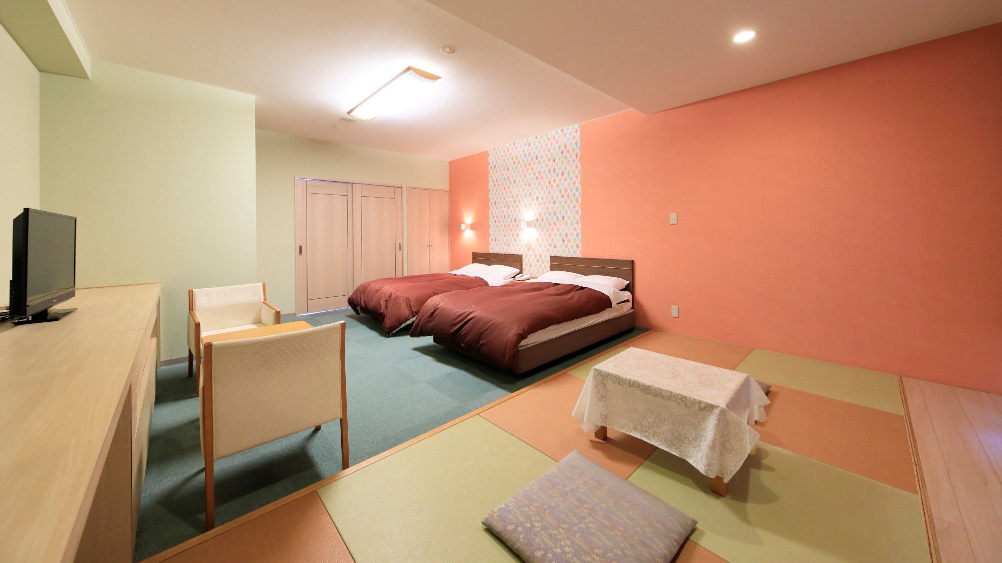 大人子供含め4名のお部屋です。禁煙室・洗浄トイレ付・洗面所・テレビ(BS無)・無料冷蔵庫・ツインベッド+4畳(3名様よりお布団のご用意させていただきます。)