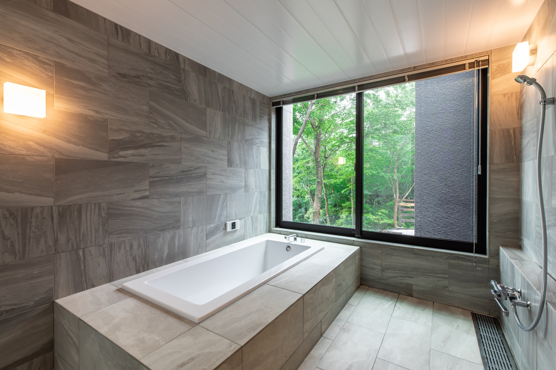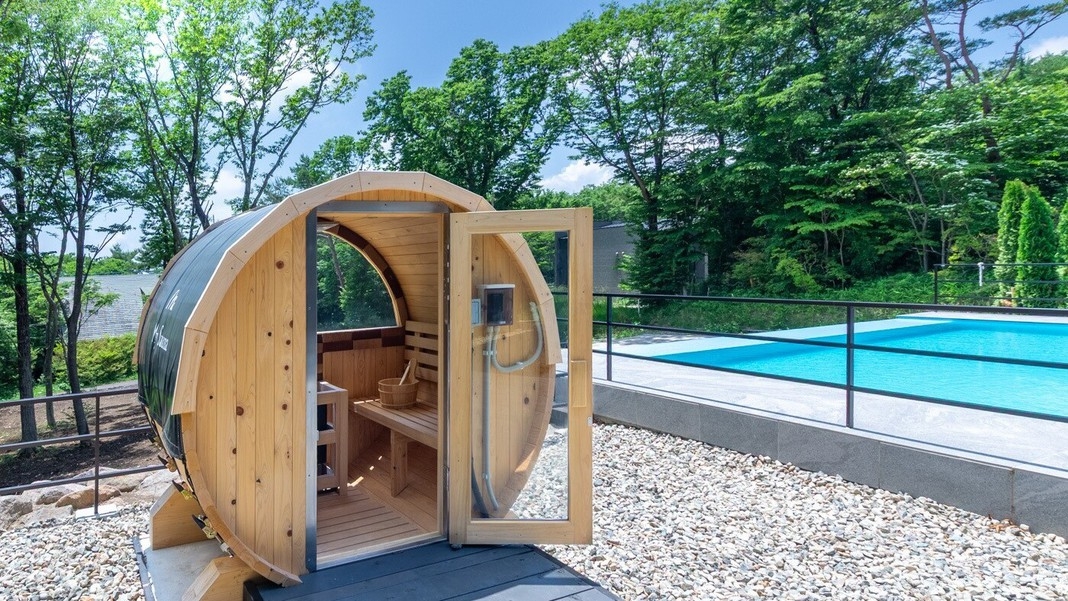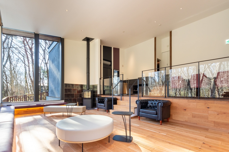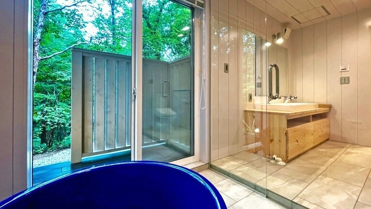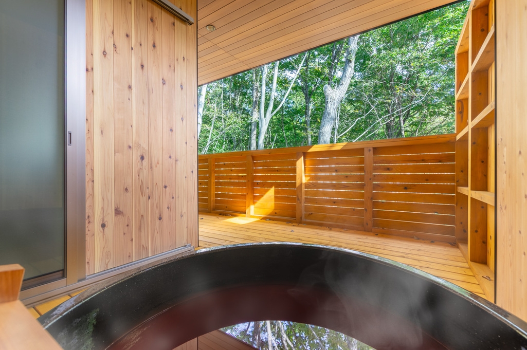 檜をふんだんに利用した別荘で半露天風呂と専用サウナを完備しています。【露天風呂付】【暖炉付き】