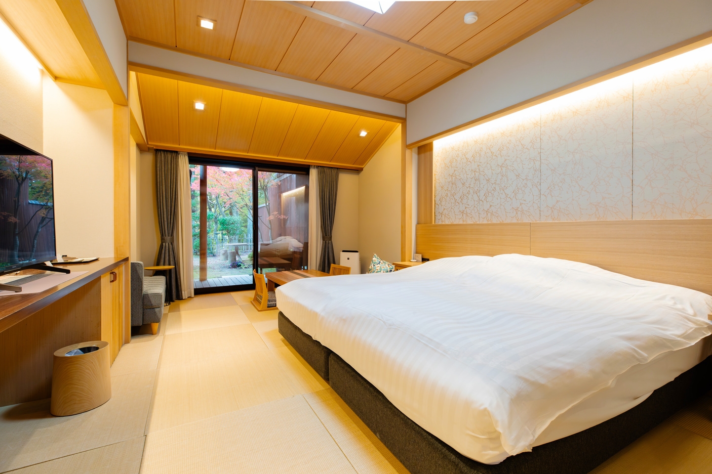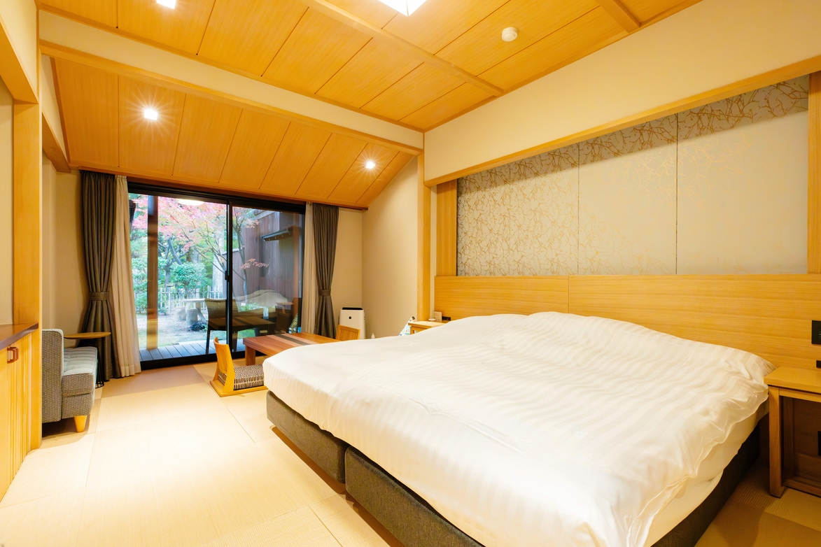 2024年3月リニューアル。 伝統木工「組子」を取り入れた洋室。 コンパクトながらもクイーンサイズのベッドとカウチを配した使いやすいお部屋。 窓からは四季折々の