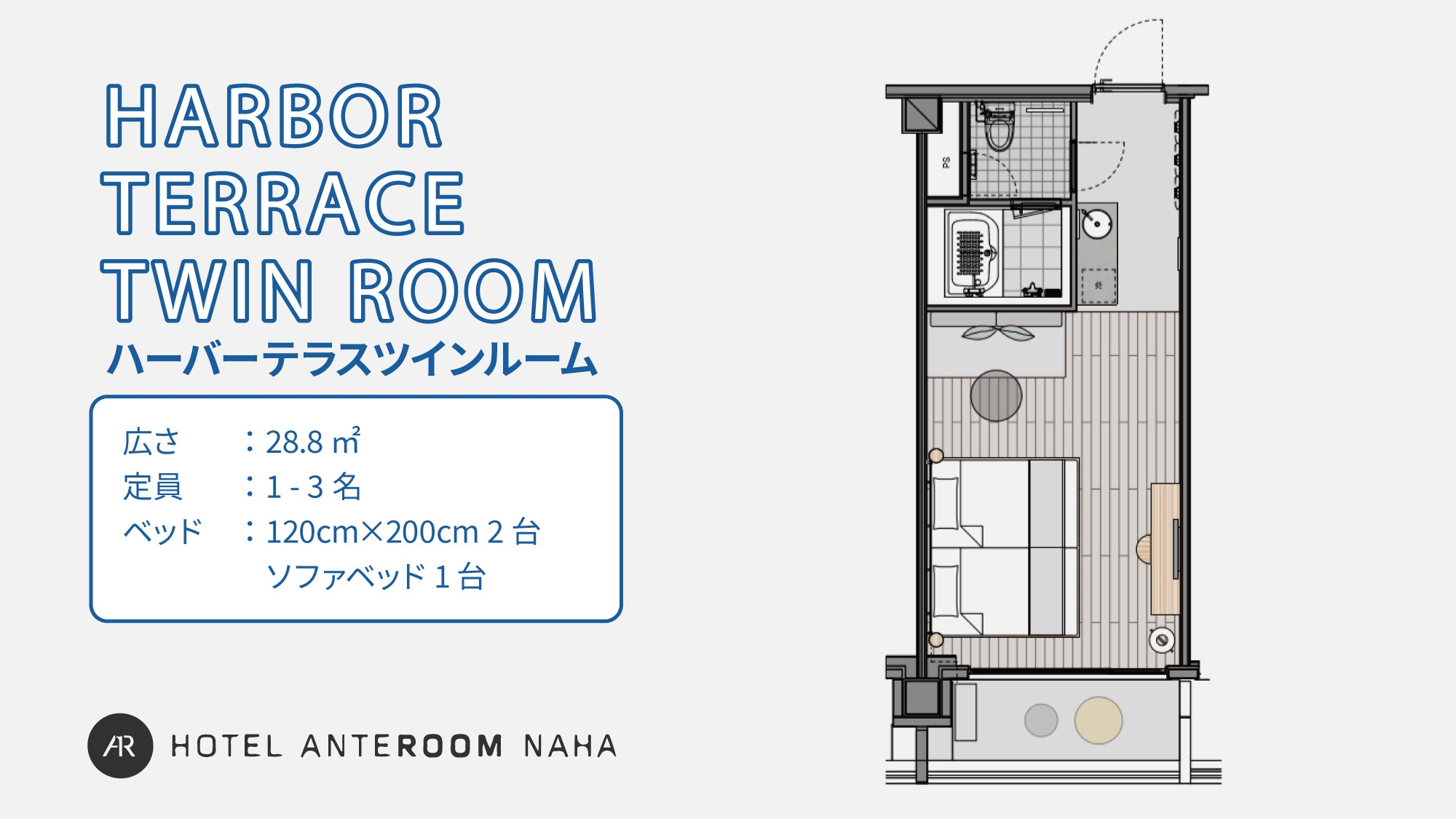 セミダブルベッド2台+ソファベッド1台|バスタブあり・ハーバービュー / バルコニー有<28.8平米>