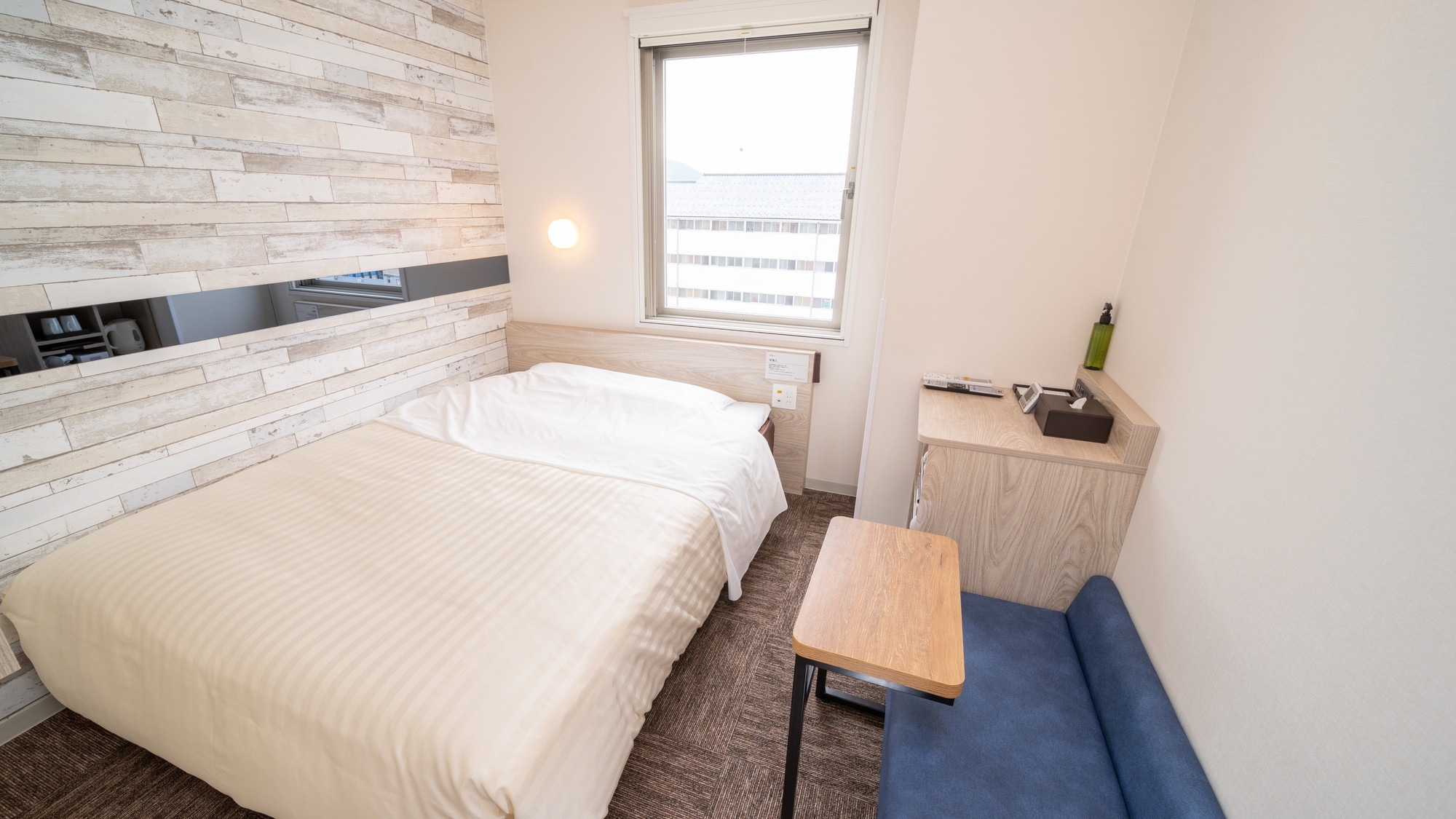 150cm幅のワイドベッド+広々デスクの【エクストラルーム】です。広々デスクで仕事や作業がしやすいお部屋です。