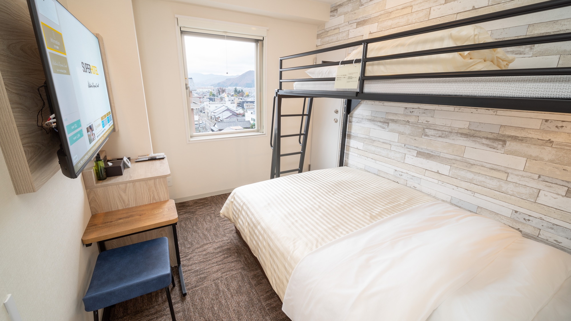 ダブルサイズのワイドベッドとお子様に人気のロフトベッド付の【スーパールーム】です。ご家族にお勧めです。