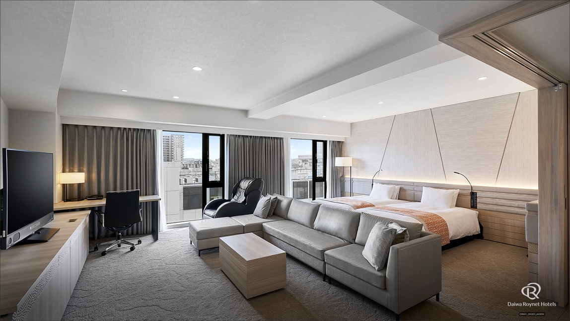 広々53平米・高層階。ベッド幅110cm(2台)。マッサージチェア設置 大人3、4名利用でエキストラベッド設置