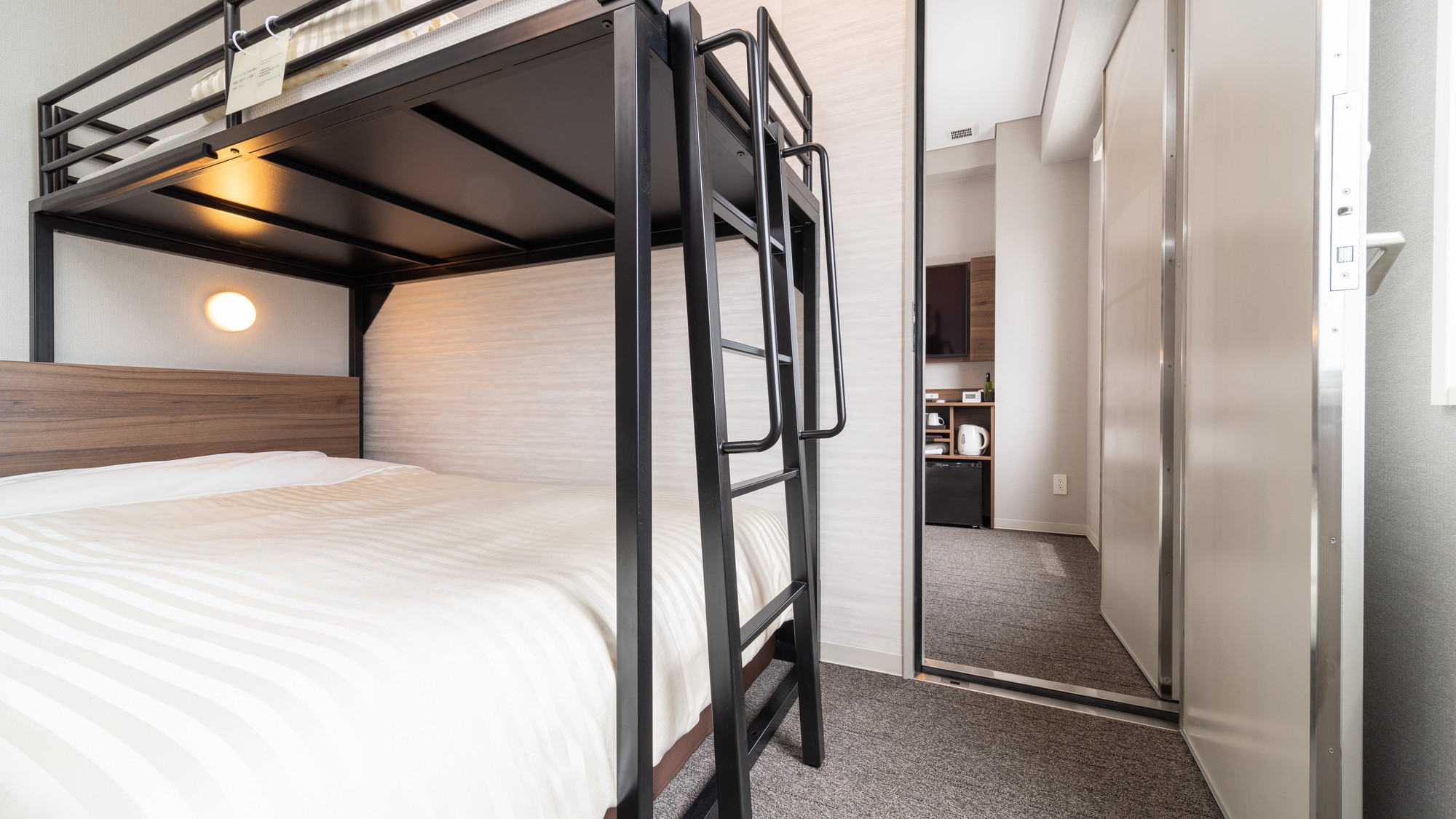 150cm幅のワイドベッド1台+ロフトベッド付きのお部屋です。 お子様に大人気♪ご家族にお勧めです。