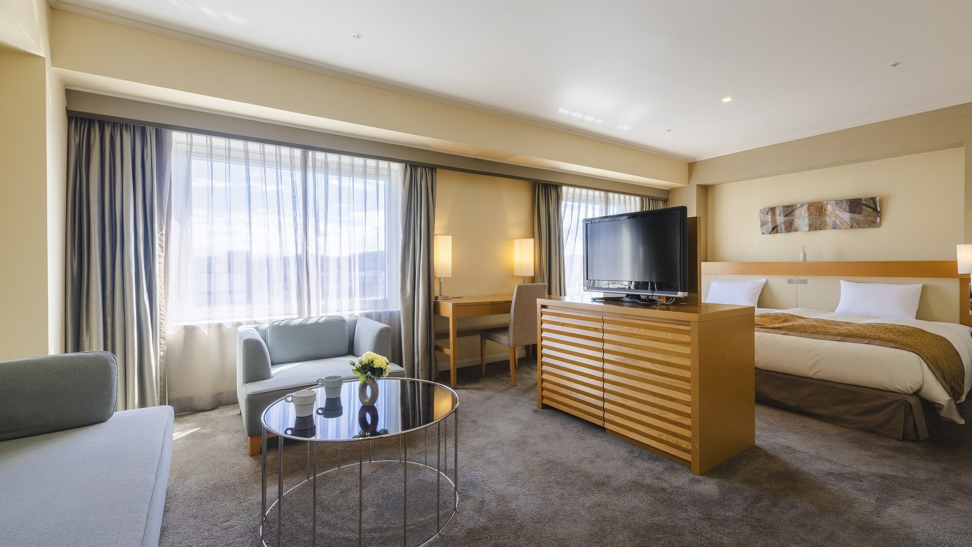 広さ42平米(定員4名)/ ベッド幅:120cm×2台 / 全室Wi-Fi無料 / 液晶テレビ / 温水洗浄機付トイレ/ 空気清浄機/1Fアメニティバイキング