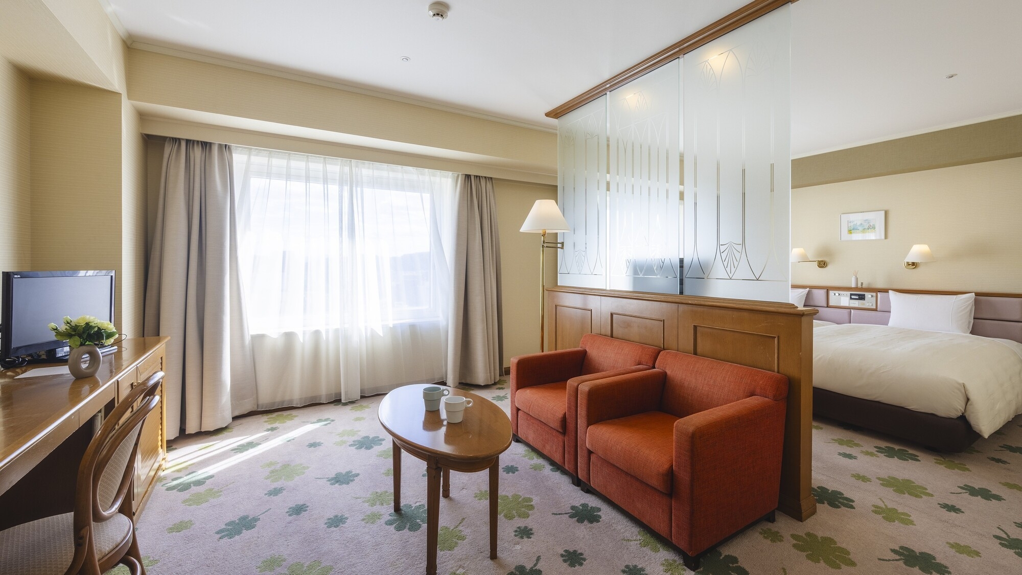 広さ:21〜23平米(定員2名様)/ ベッド幅:180cm/ 全室Wi-Fi無料 / 液晶テレビ / 温水洗浄機付トイレ完備/ 空気清浄機設置/1Fアメニティバ