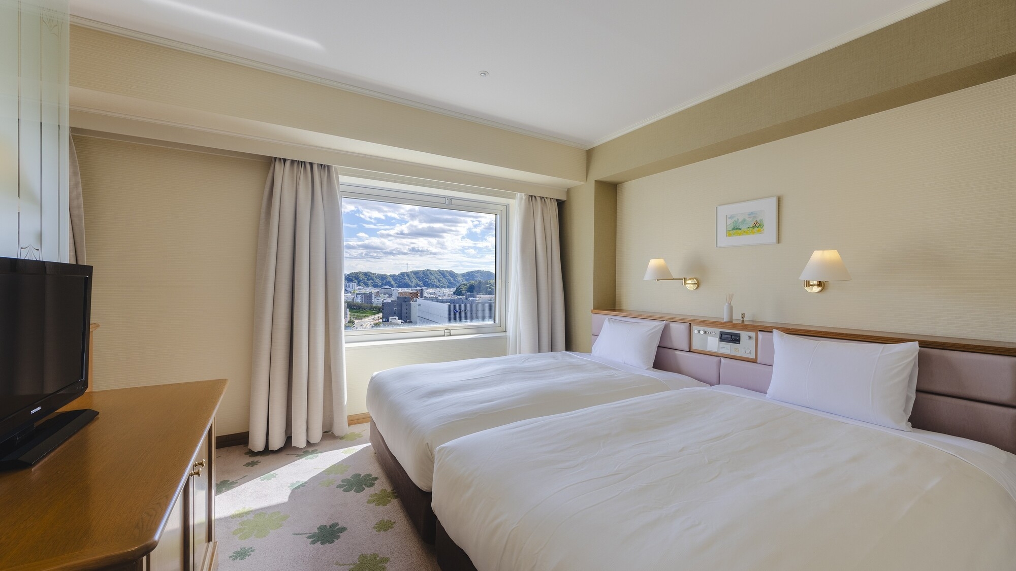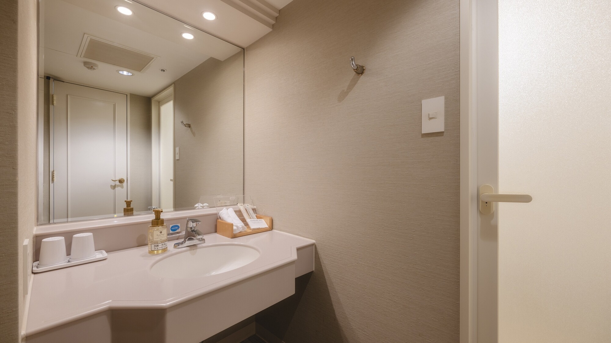 広さ21平米(定員2名)/ ベッド幅:110cm×2台 / 全室Wi-Fi無料 / 液晶テレビ / 温水洗浄機付トイレ/ 空気清浄機/1Fアメニティバイキング