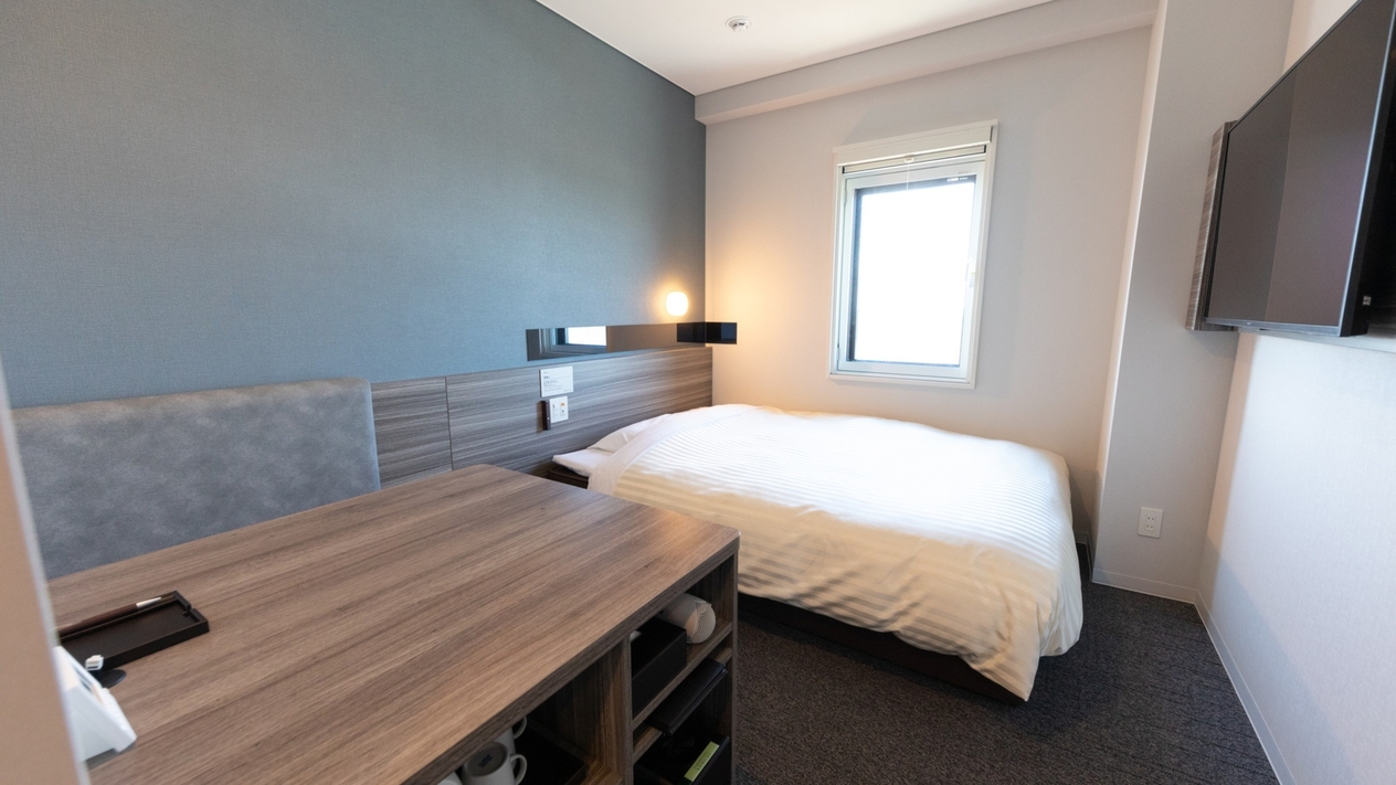 150cm幅のダブルベッド+広々デスクの【エクストラルーム】です。 広々デスクで仕事や作業がしやすいお部屋です。