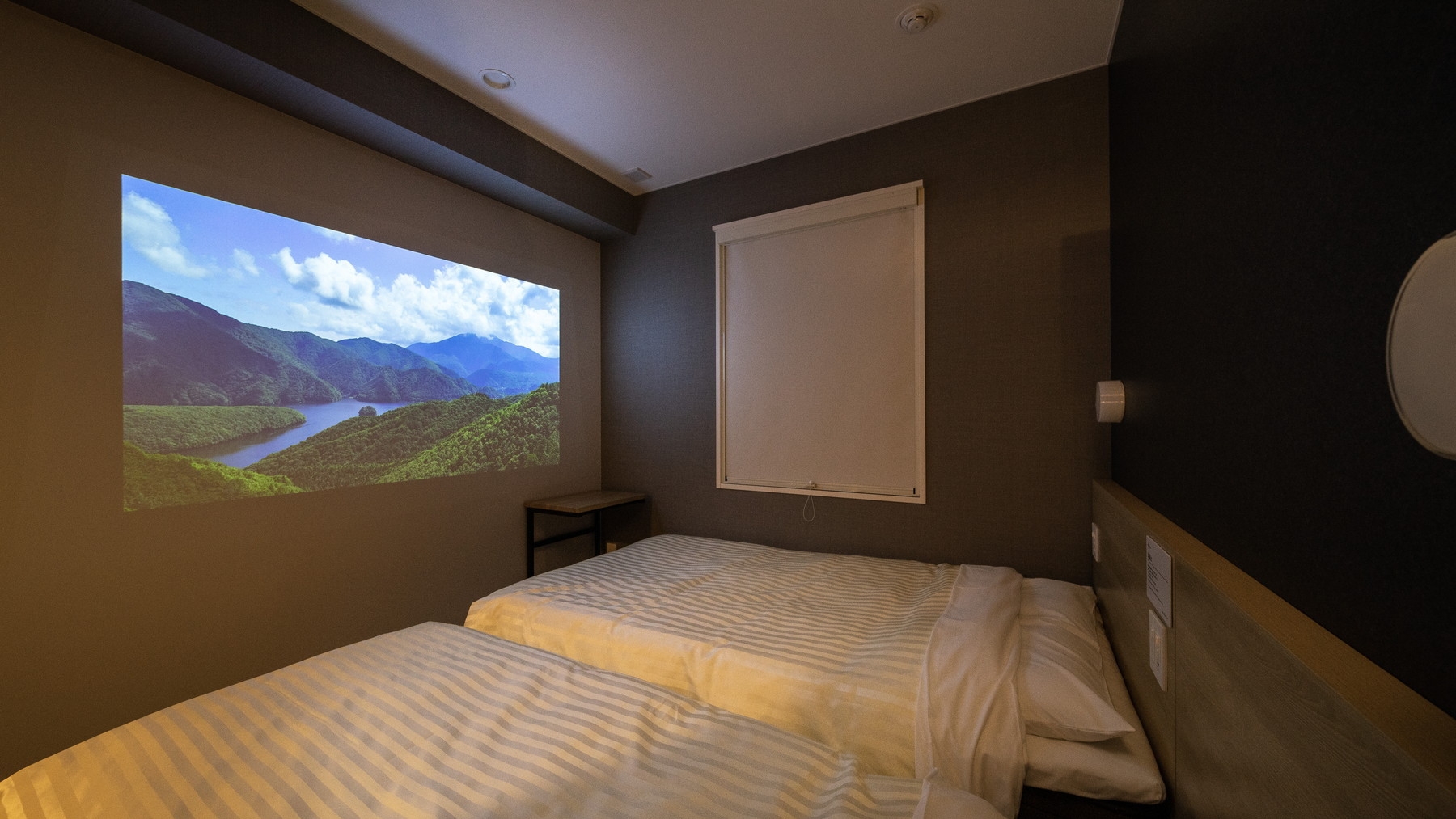 プロジェクターが観れるお部屋で120cm幅のシングル、90cm幅のエキストラベッドをご用意しております。