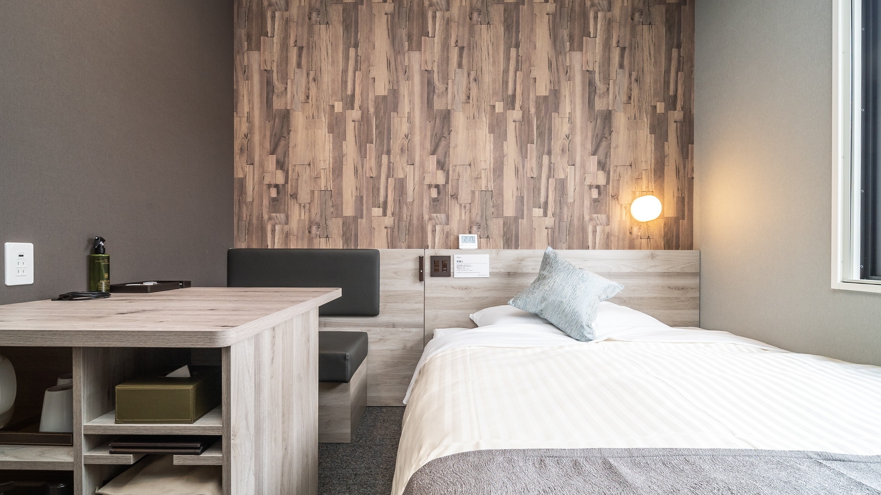 150cm幅のワイドベッド+広々デスクの【エクストラルーム】です。 広々デスクで仕事や作業がしやすいお部屋です。