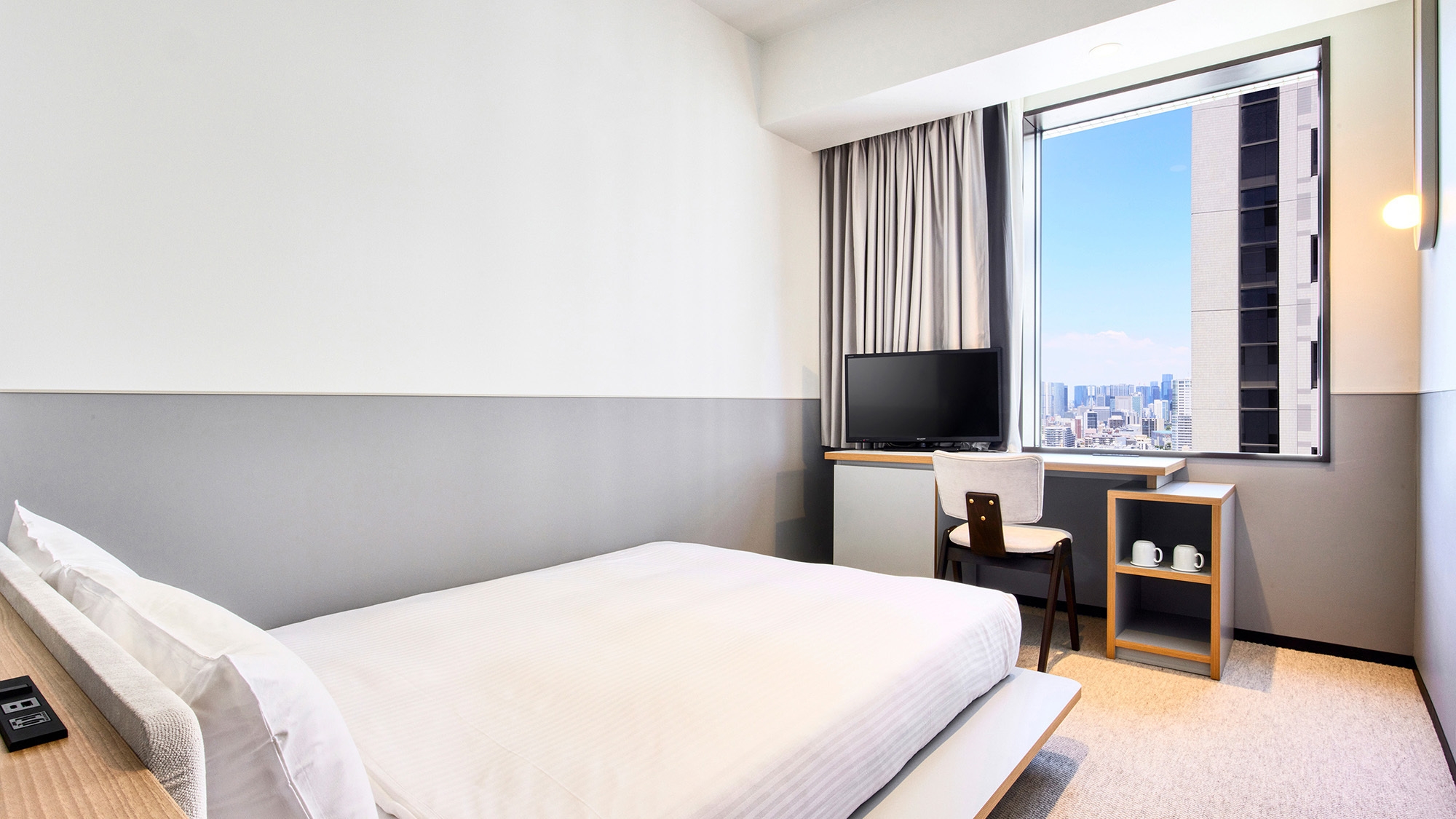 17平米とコンパクトながら、シンプルで機能的な客室です。1400mm幅のベッドを1台配し、最大2名様までご宿泊可能です。歯ブラシがフロント提供に変更となります。