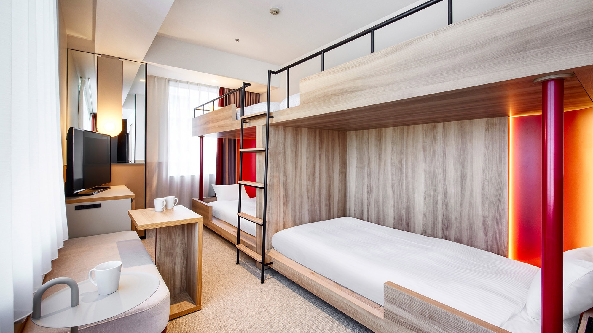 【リニューアル】二段ベッドとソファを備えた機能的な客室 です。ソファをベッドとして利用する事で、最大3名様まで ご宿泊可能で、ご友人やご家族との宿泊に最適です。