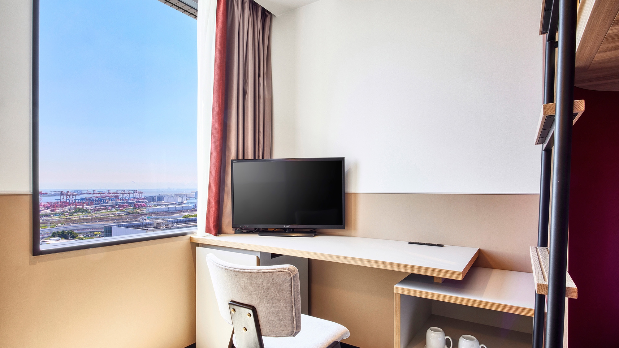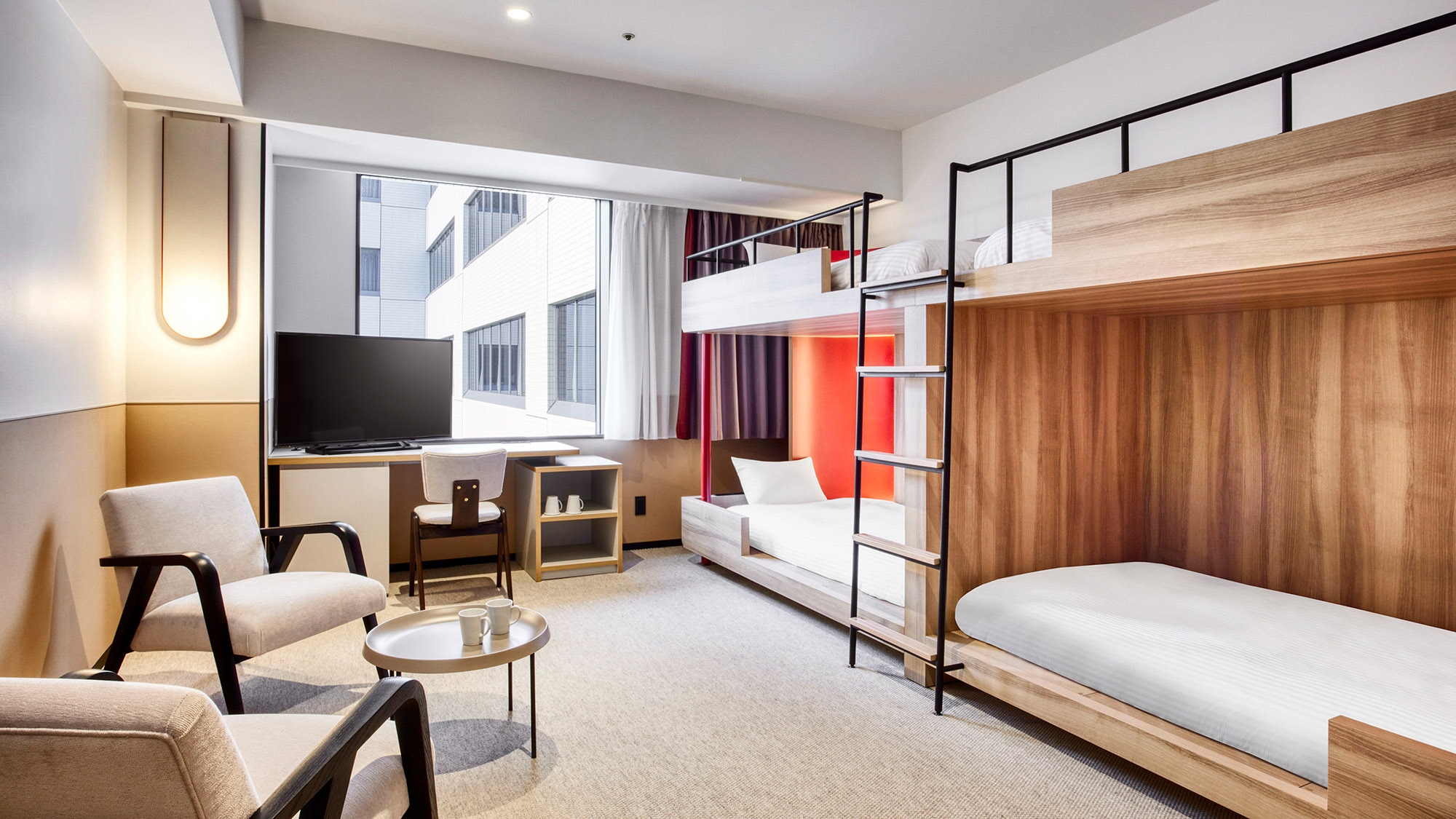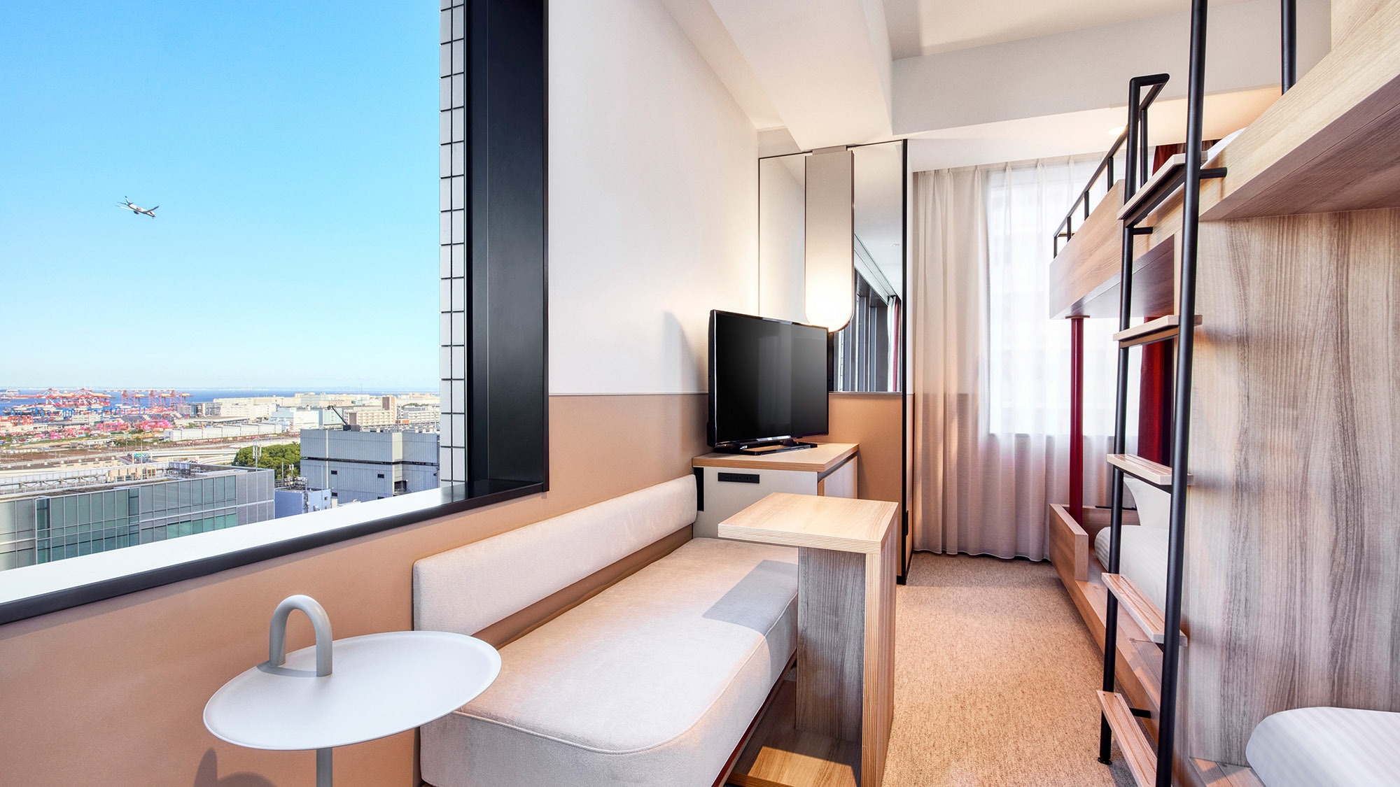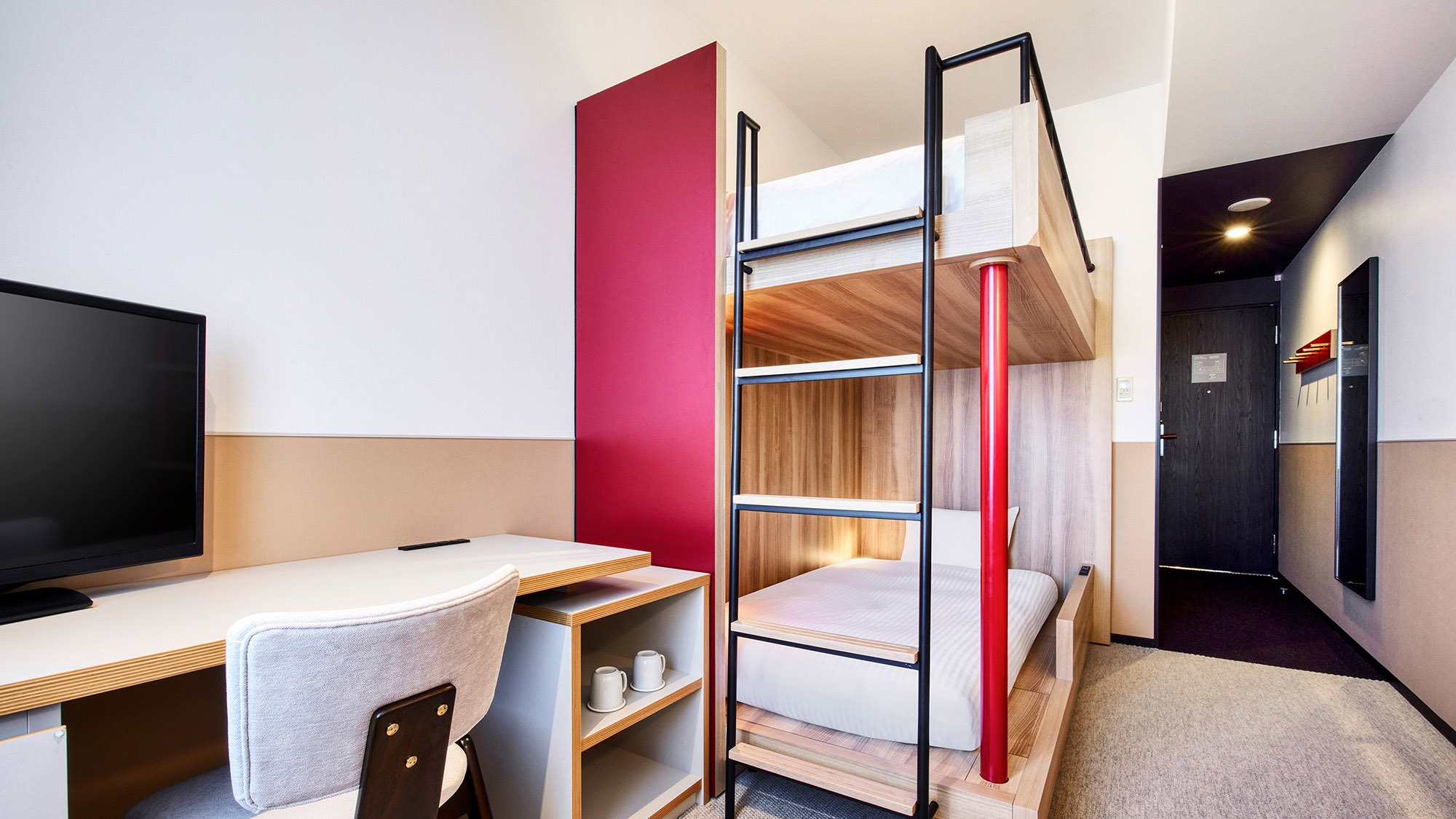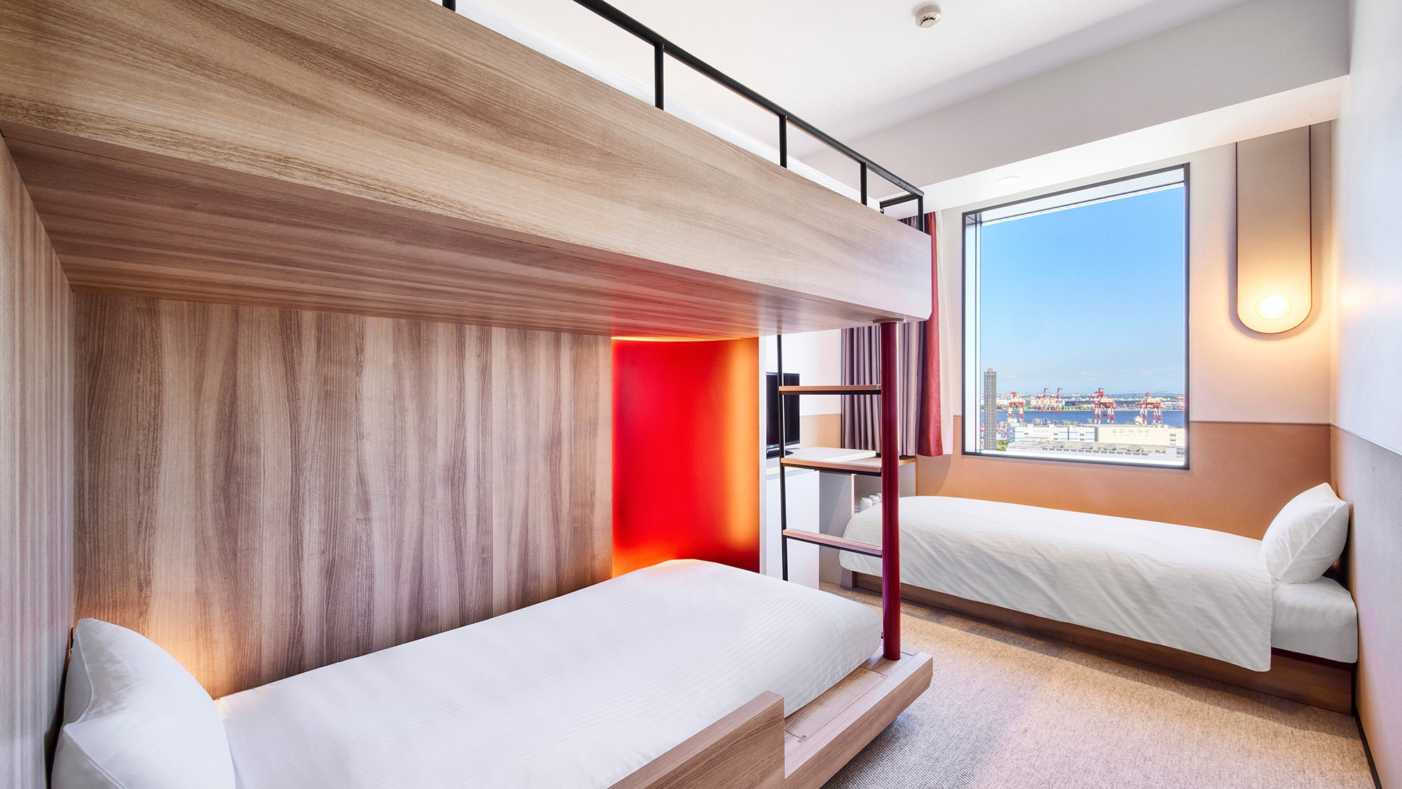 【リニューアル】木目調の温かみのある内装と、港湾地区 の景観をイメージした色のアクセントが効いたモダンな二 段ベッドルームです。