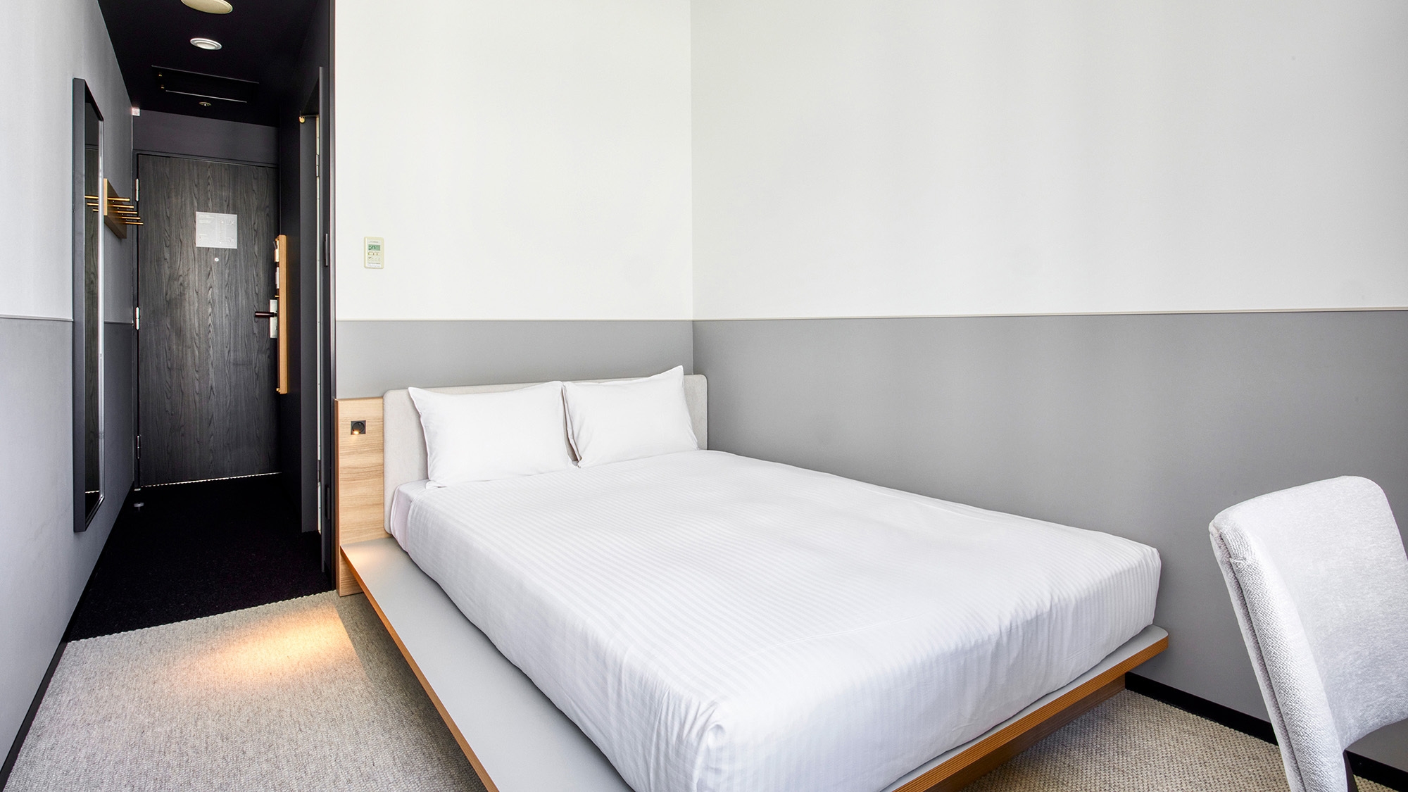 21平米の客室に1600mm幅のベッドと、1名掛けのソファを配したダブルルームです。すこし贅沢な一人旅にもご利用ください。歯ブラシがフロント提供に変更となります