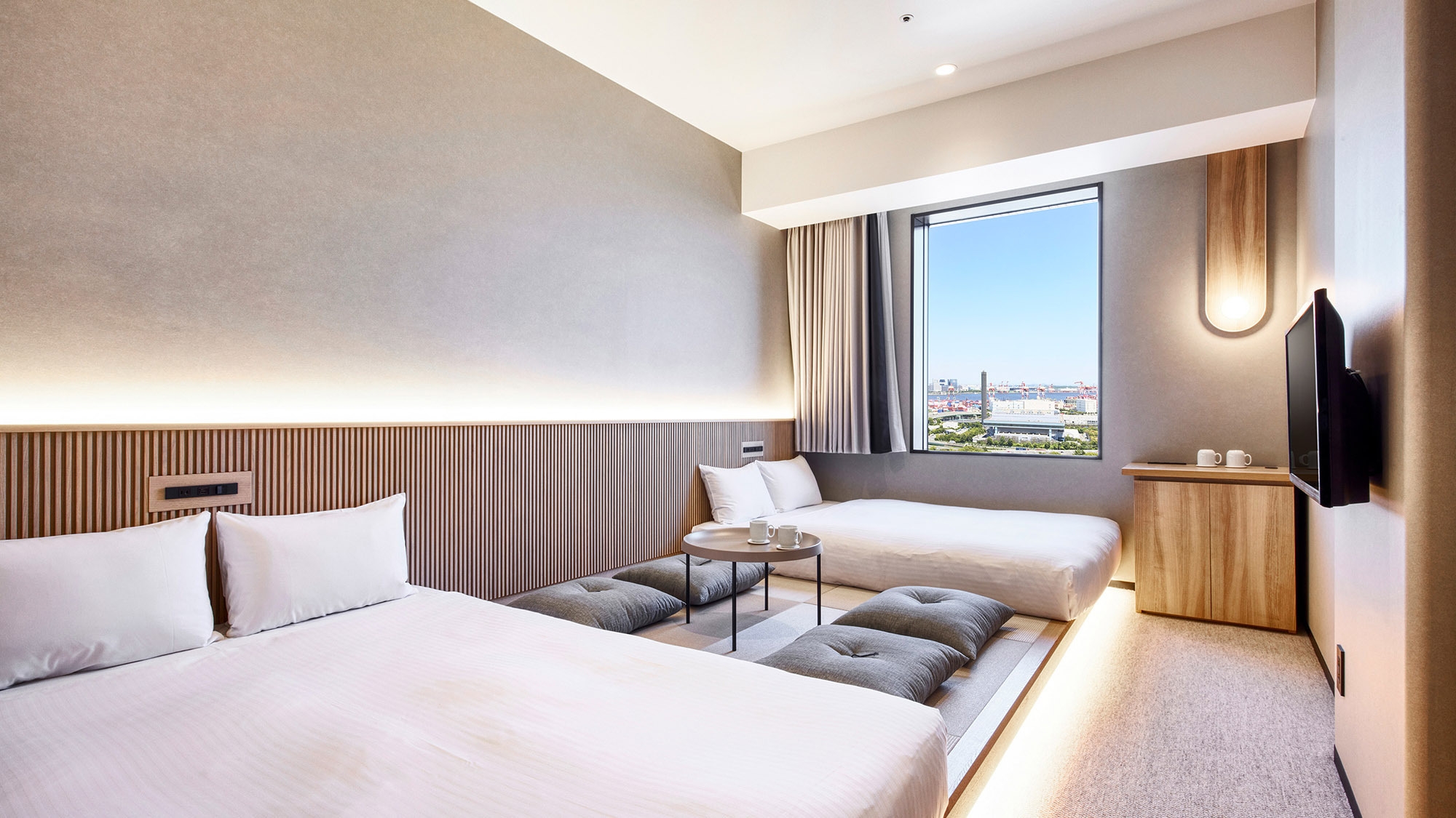 【リニューアル】和モダンの落ち着いた雰囲気の客室です。 小上がりの畳の上に、ロータイプのベッド2台とローテーブ ルを設置、「和」の趣を活かし団らんを演出します。