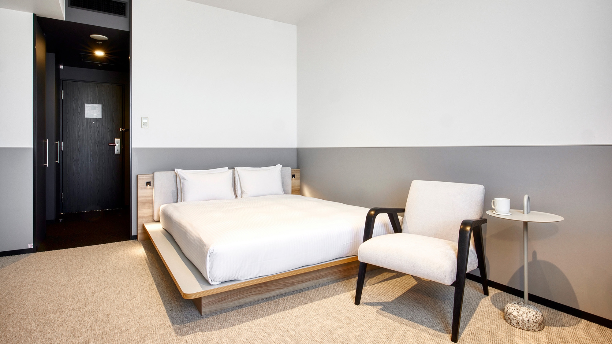 【リニューアル】落ち着いたグレーと白を基調としたモダンな 客室です。 広々としたベッドに加えて、デスク、テレビ、一人掛けソファ が備わっています。