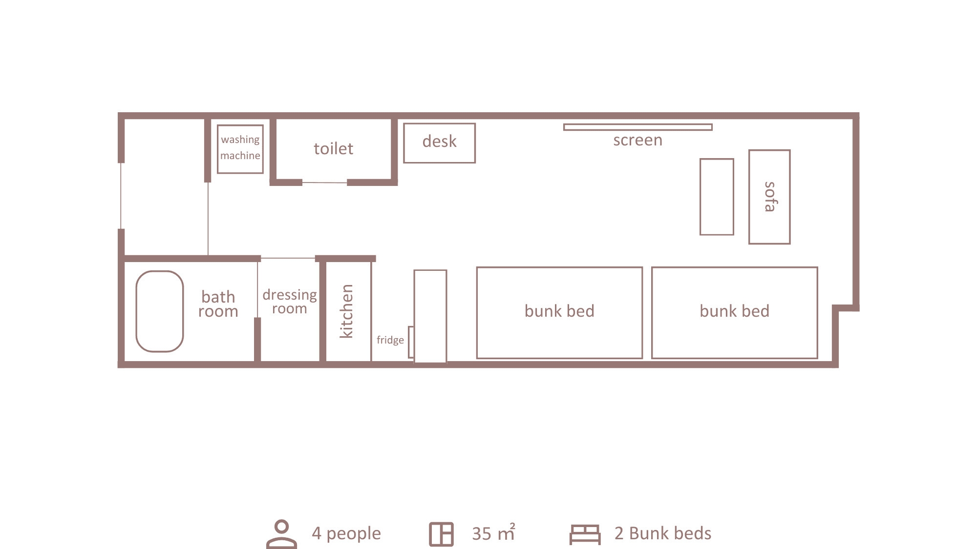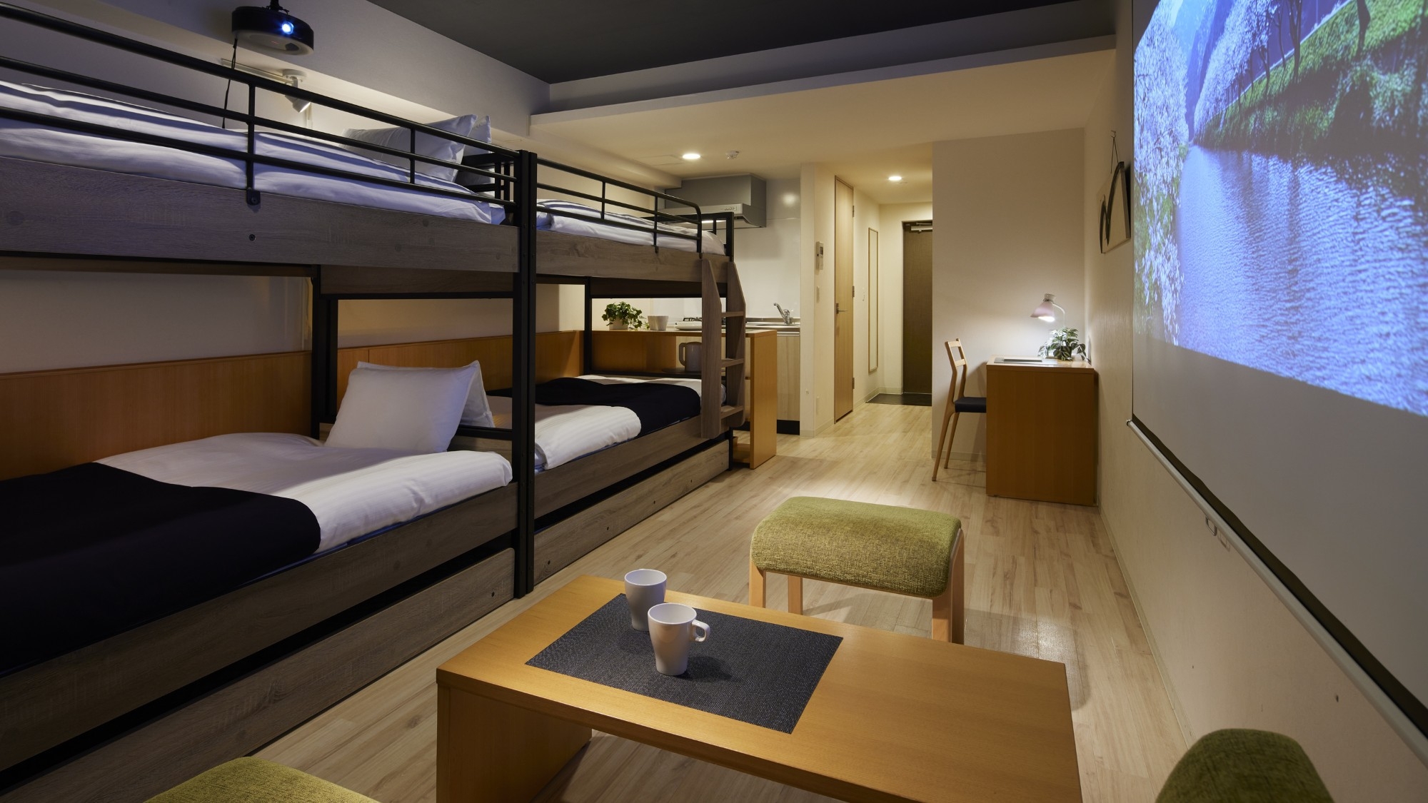 2段ベッド(シングルサイズ)x 2台、キッチン・ダイニングスペース・洗濯機・無料Wi-Fi完備・バストイレセパレート。