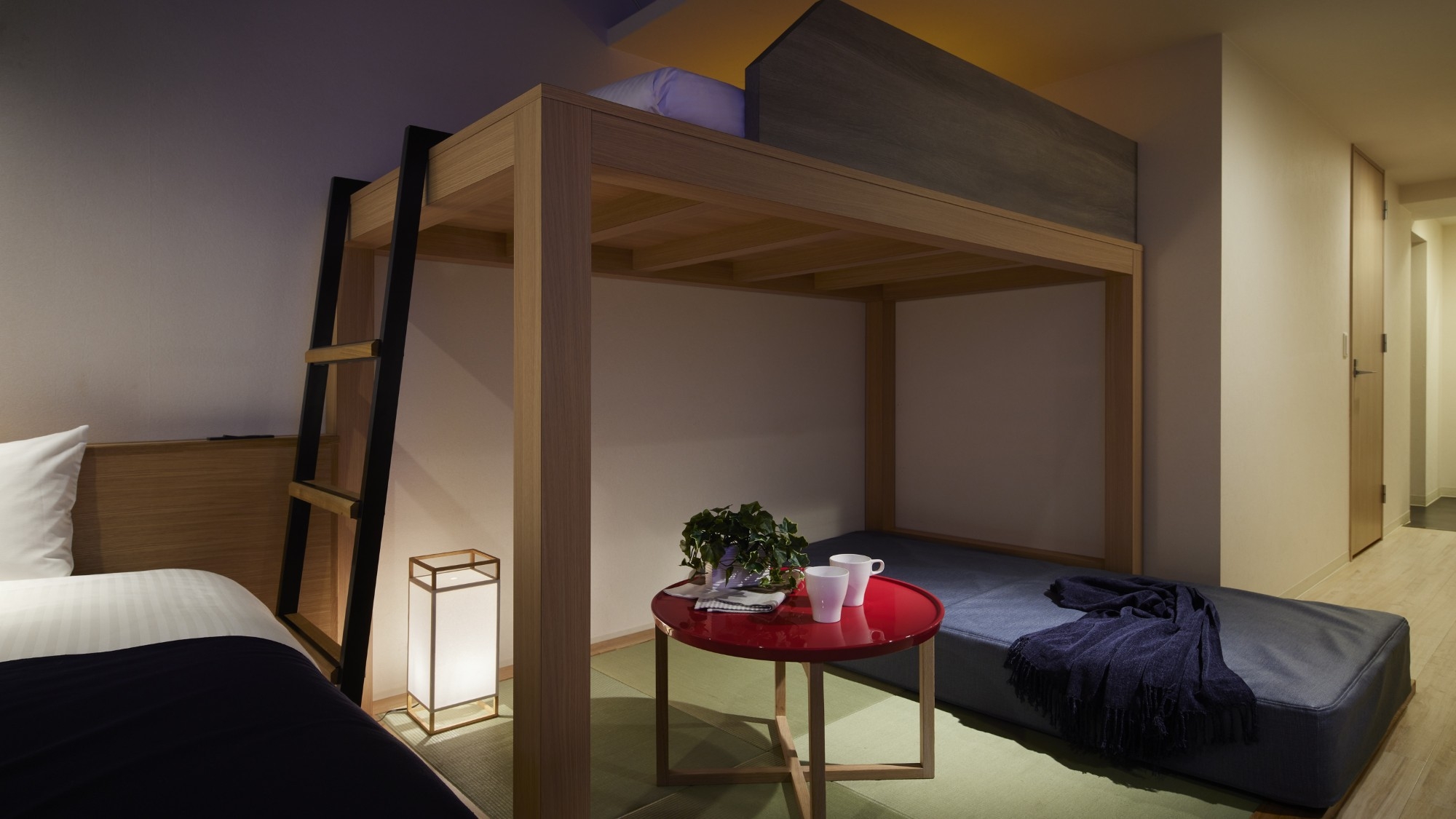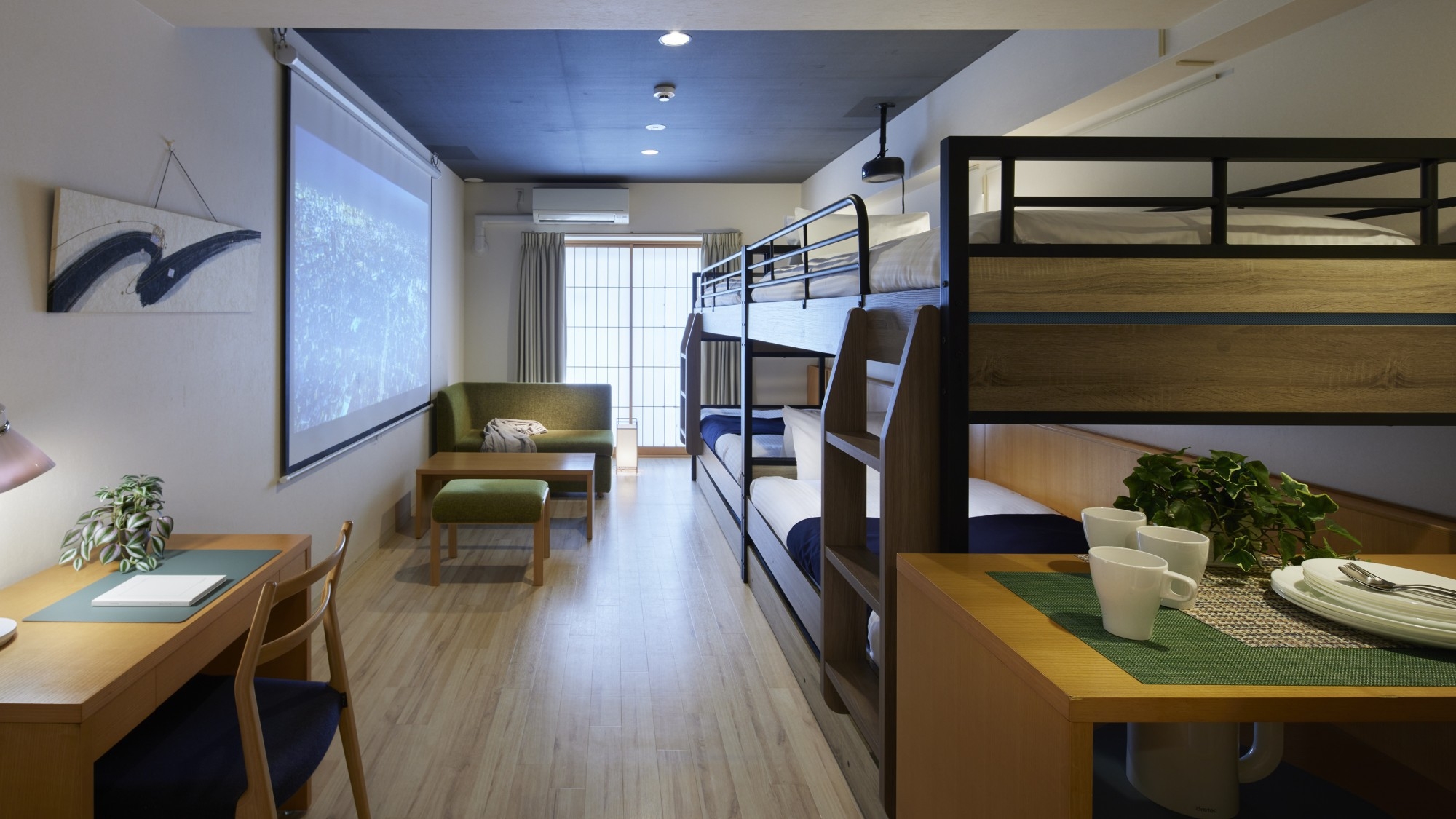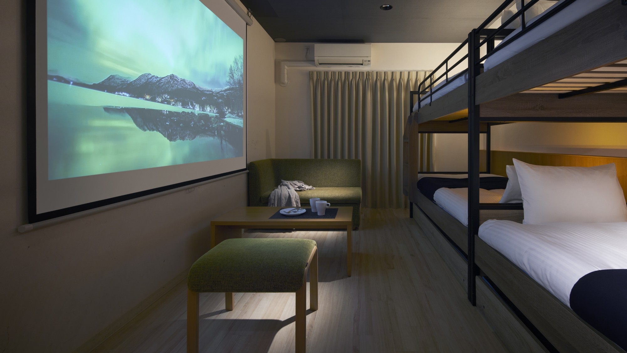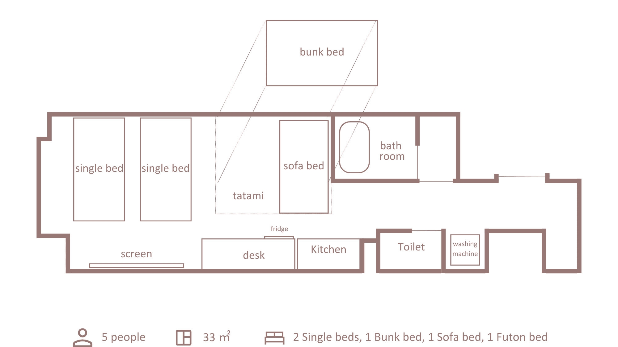 シングルベッド2台、2段ベッド1台(上段部分のみ)、ソファベッド1台、布団1組、キッチン・ダイニングスペース・洗濯機・無料Wi-Fi完備・バストイレセパレート。