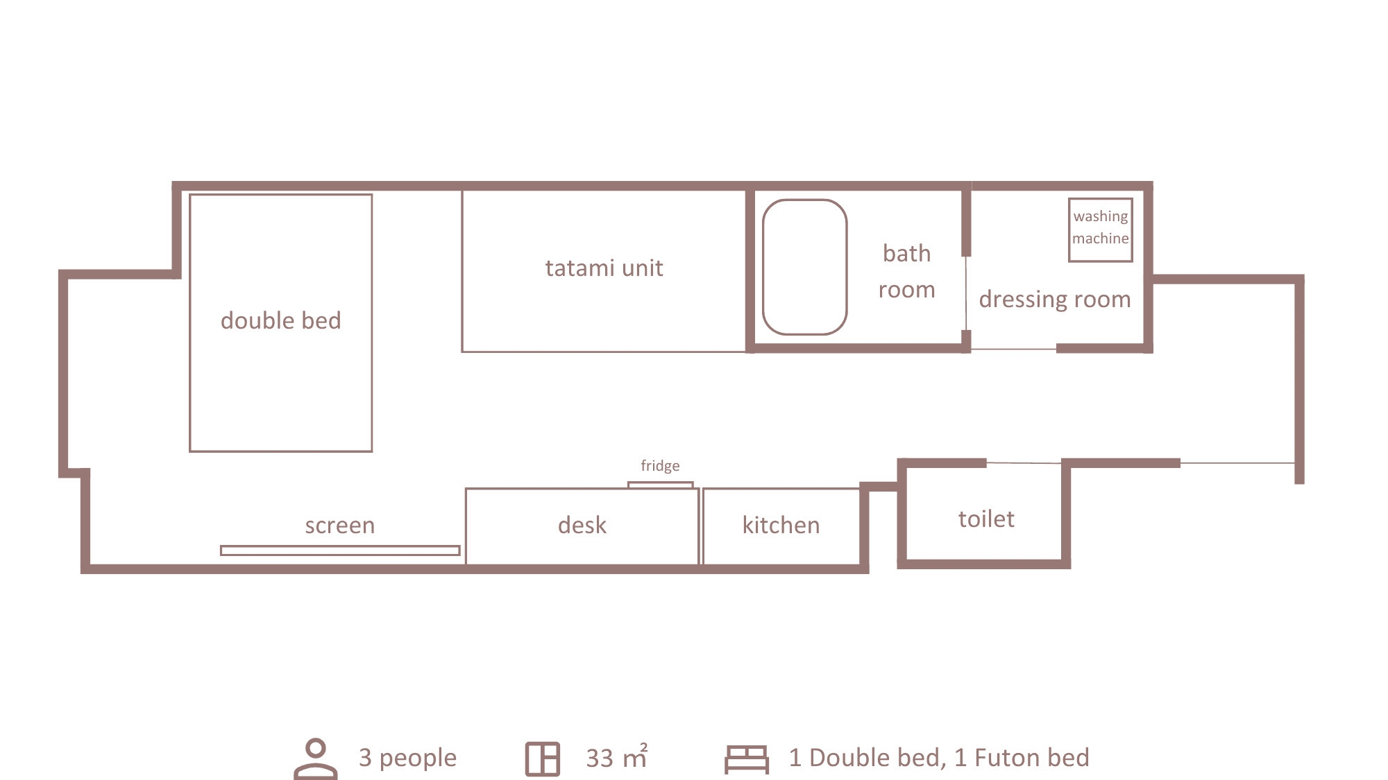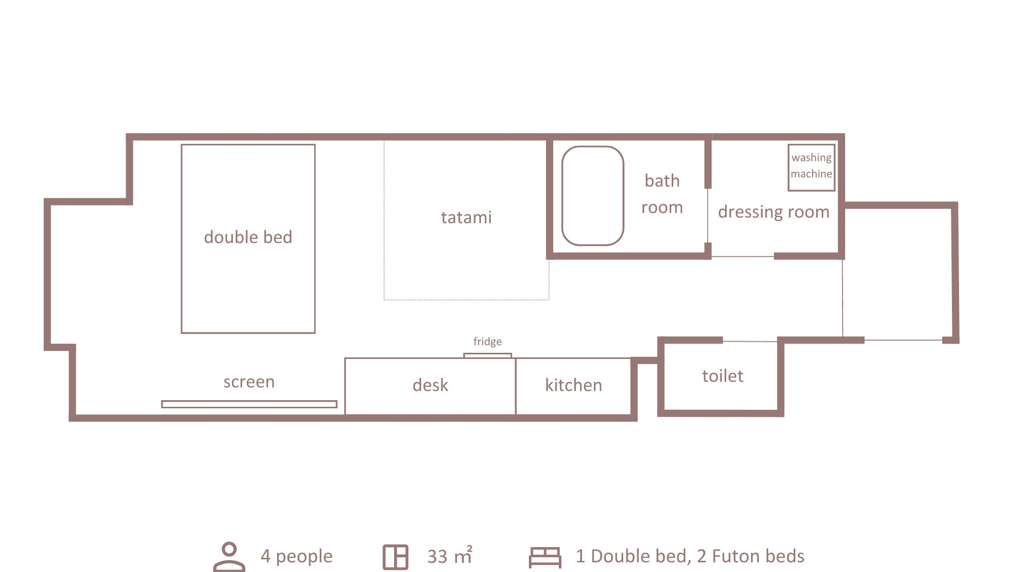 ダブルベッド1台+布団1組、キッチン・ダイニングスペース・洗濯機・無料Wi-Fi完備・バストイレセパレート。