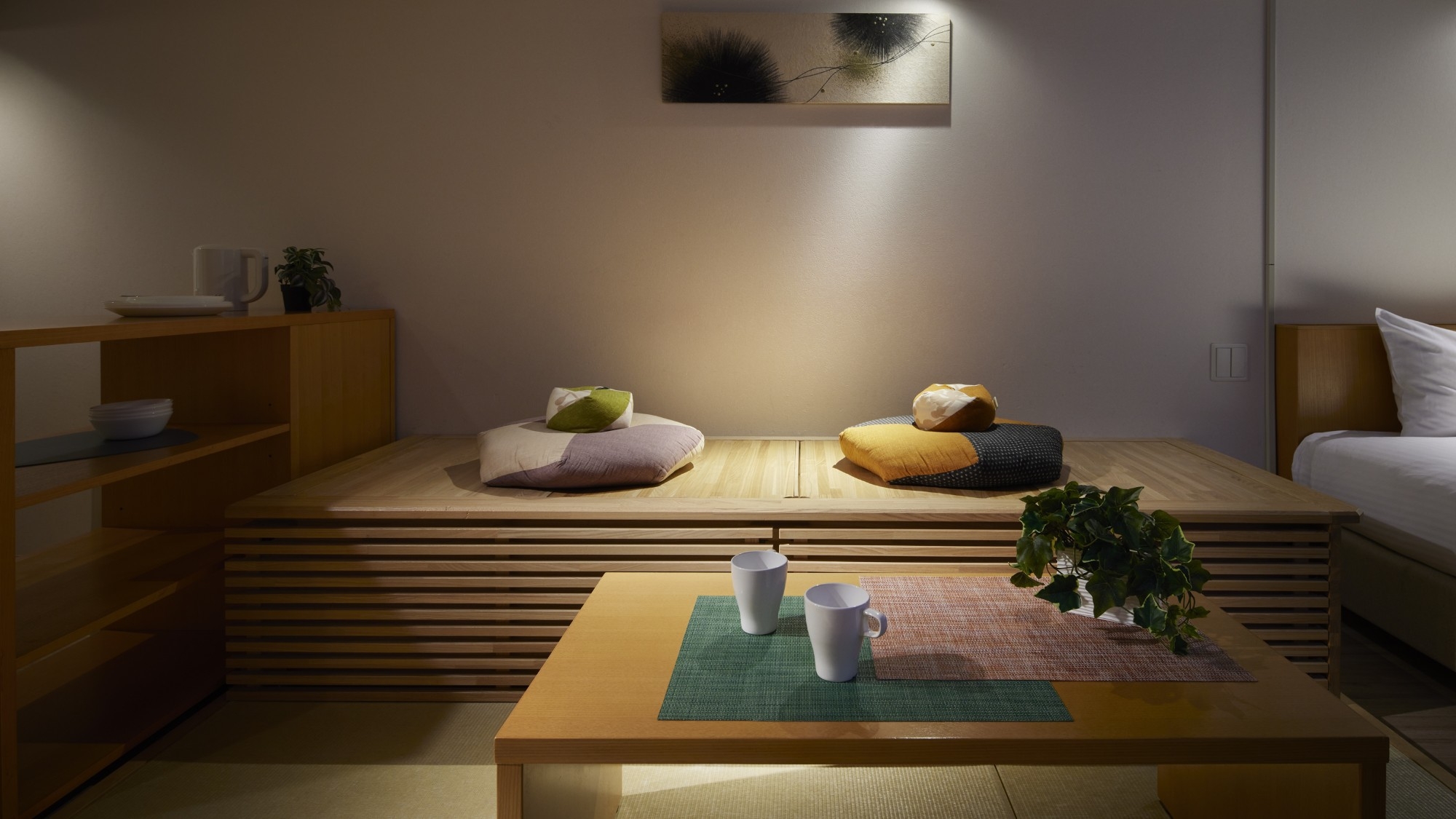 ダブルベッド1台、布団2組、キッチン・ダインイングスペース・洗濯機・無料Wi-Fi完備・バストイレセパレート。
