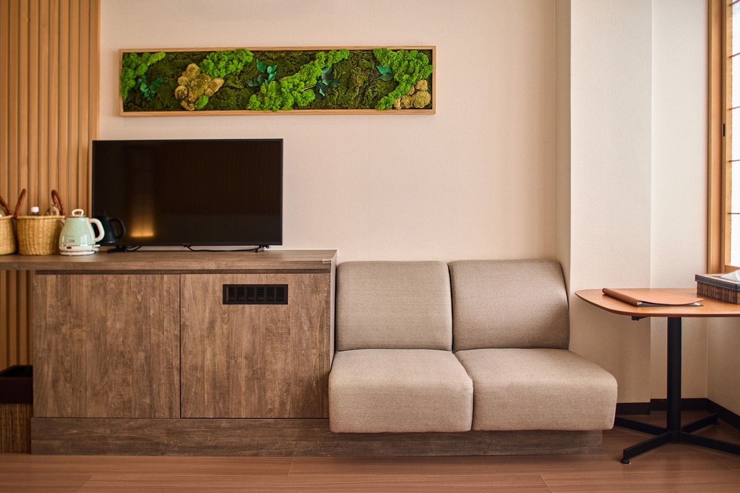 セミダブルベッド2台と畳スペースにはソファとテーブルをご用意しました。木の温もりあふれる和モダンなお部屋です。添い寝のお子様は2名様までご利用可能です。