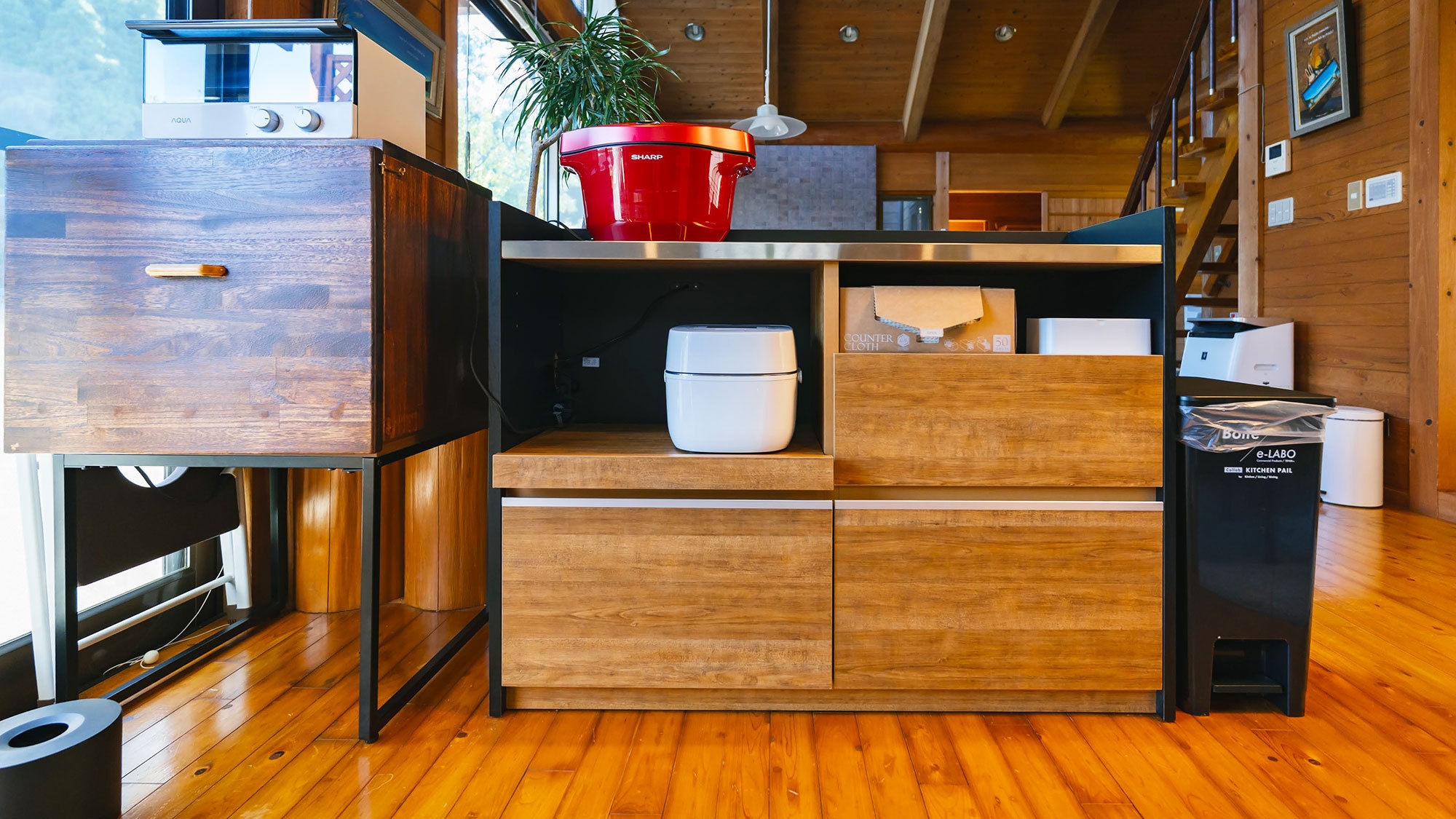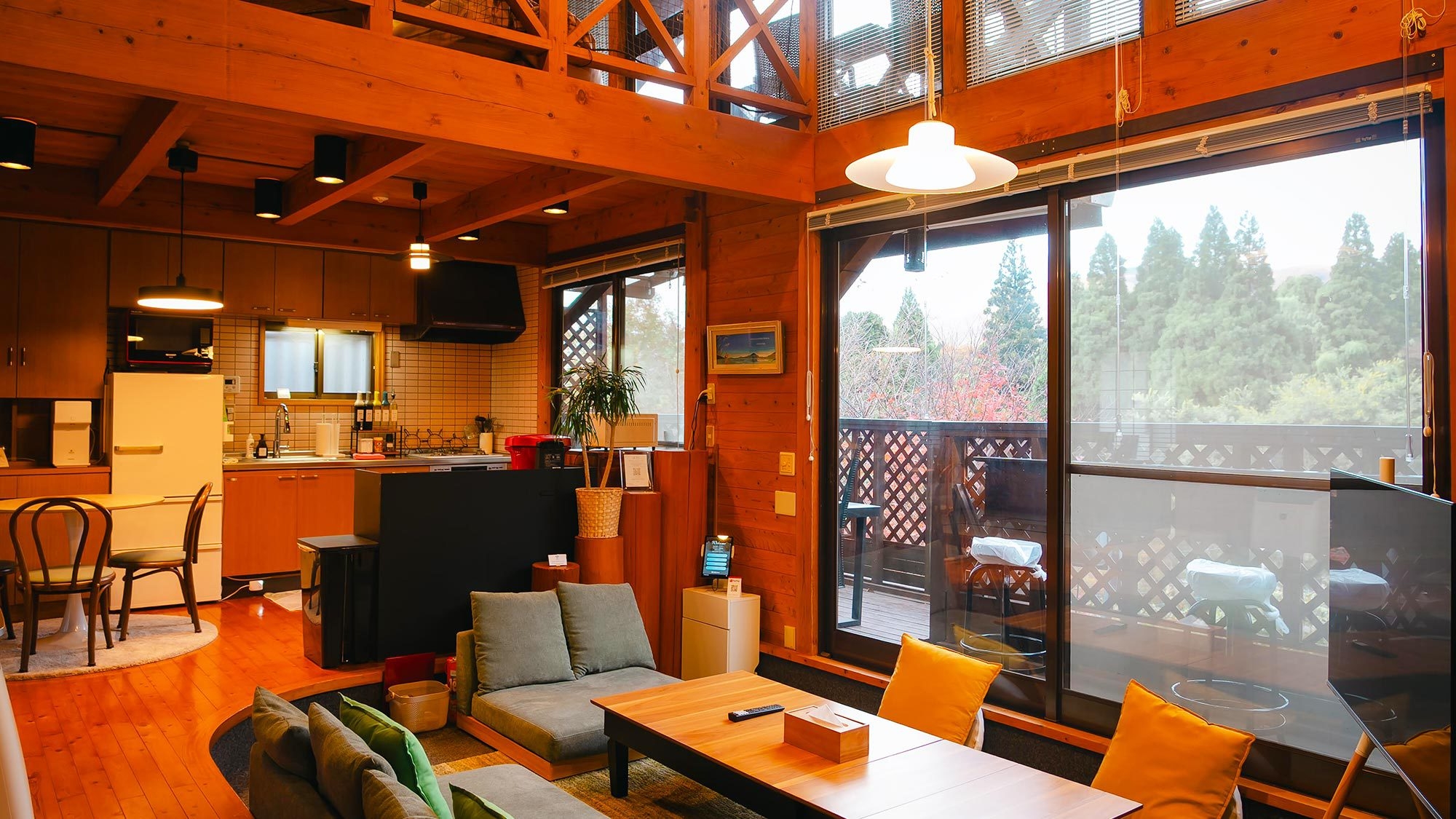 小国杉の無垢材を使った温かみのある、温泉付きコテージ。 1階にはリビング・和室・キッチンがあり、ロフトには寝室+フリースペースがあります。