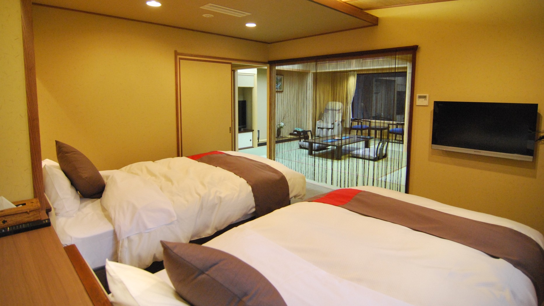 角部屋にある和洋室です。シモンズのセミダブル(120×203cm)ツインです、和モダンな上質空間で1ランク上の寛ぎをお愉しみ下さい。温泉ではございません