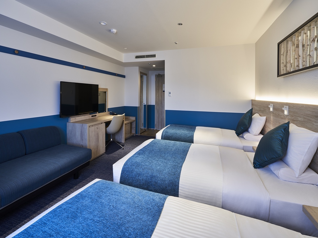 青を基調とした落ち着きのある禁煙ルームです。ソファベッドのご利用で最大4名様までご宿泊いただけます。ご家族やご友人同士でのご旅行におすすめです