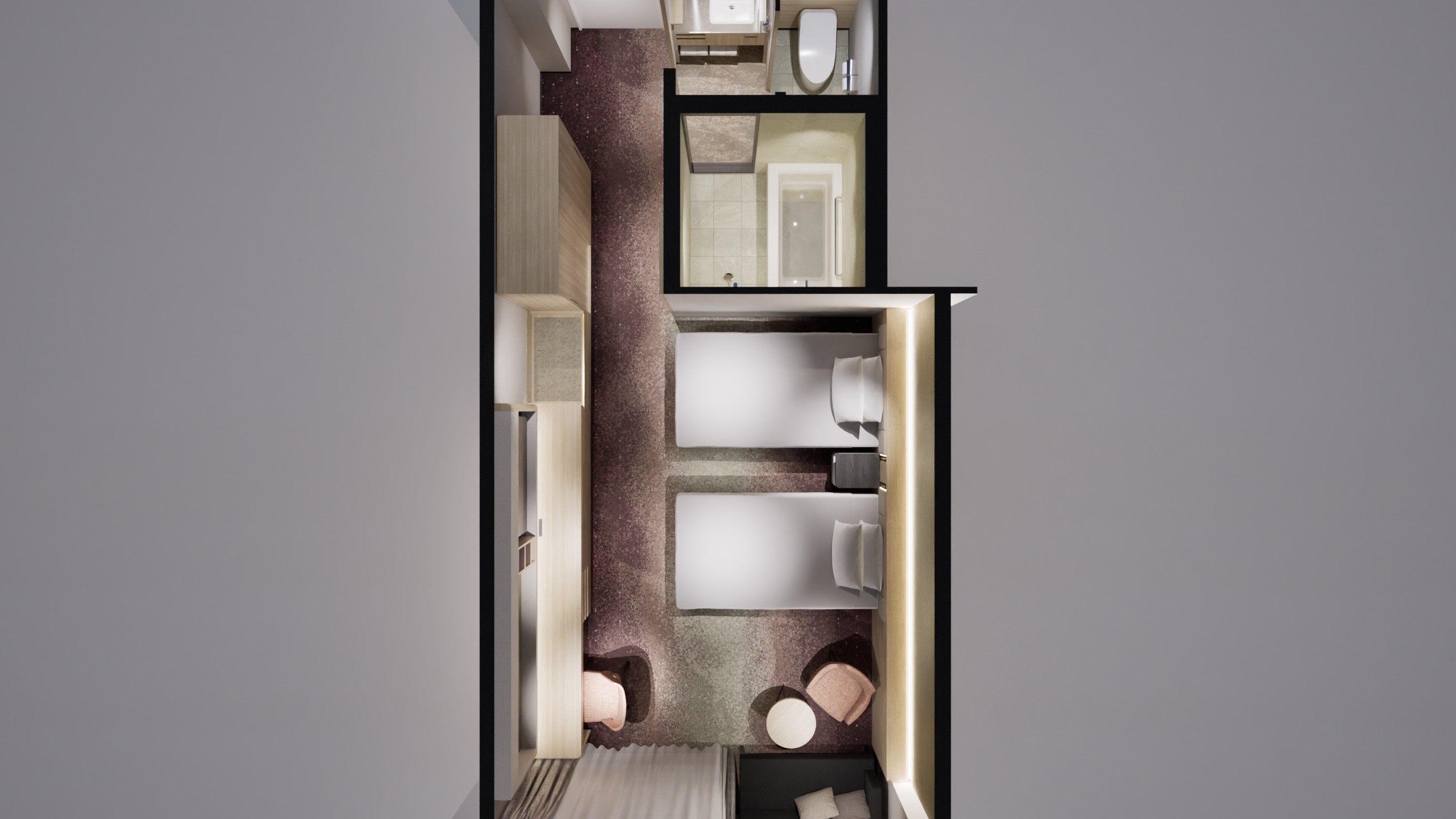 2025年9月に水回りをバス・トイレ別のお部屋に全面リニューアル。 シモンズ社のセミダブルベッドを2台配置。