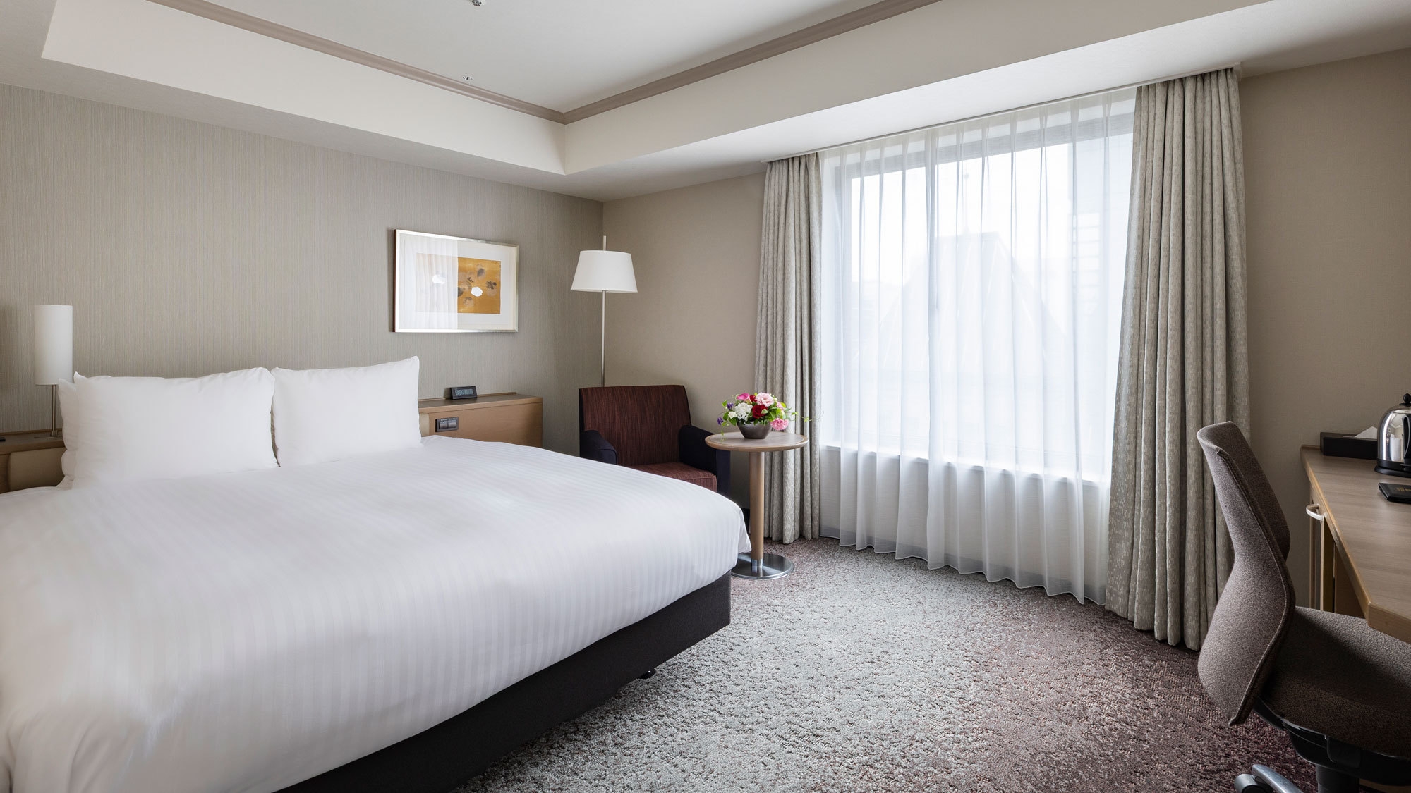 【広さ21.5平米・ベッドサイズ140x200】ゆとりのダブルベッド(140cm幅)や一人掛けのソファなど、プライベート感を贅沢にお楽しみいただけます。