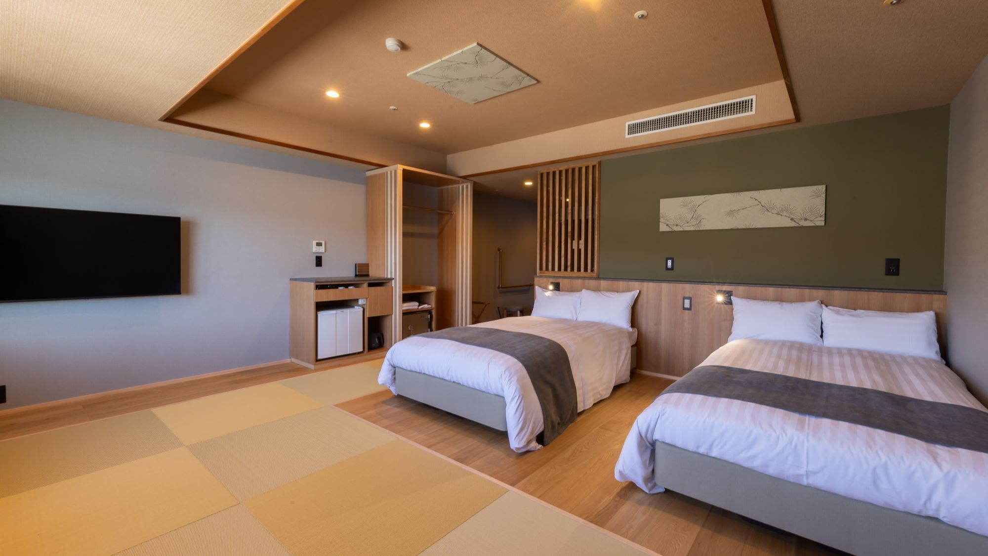 和室10畳+8畳に+広縁付のゆとりある客室。 2間とも畳敷きで、手足を伸ばしてゴロンと横になったり湯上がりにくつろいだり、素足で気持ちよく過ごせるのが魅力。