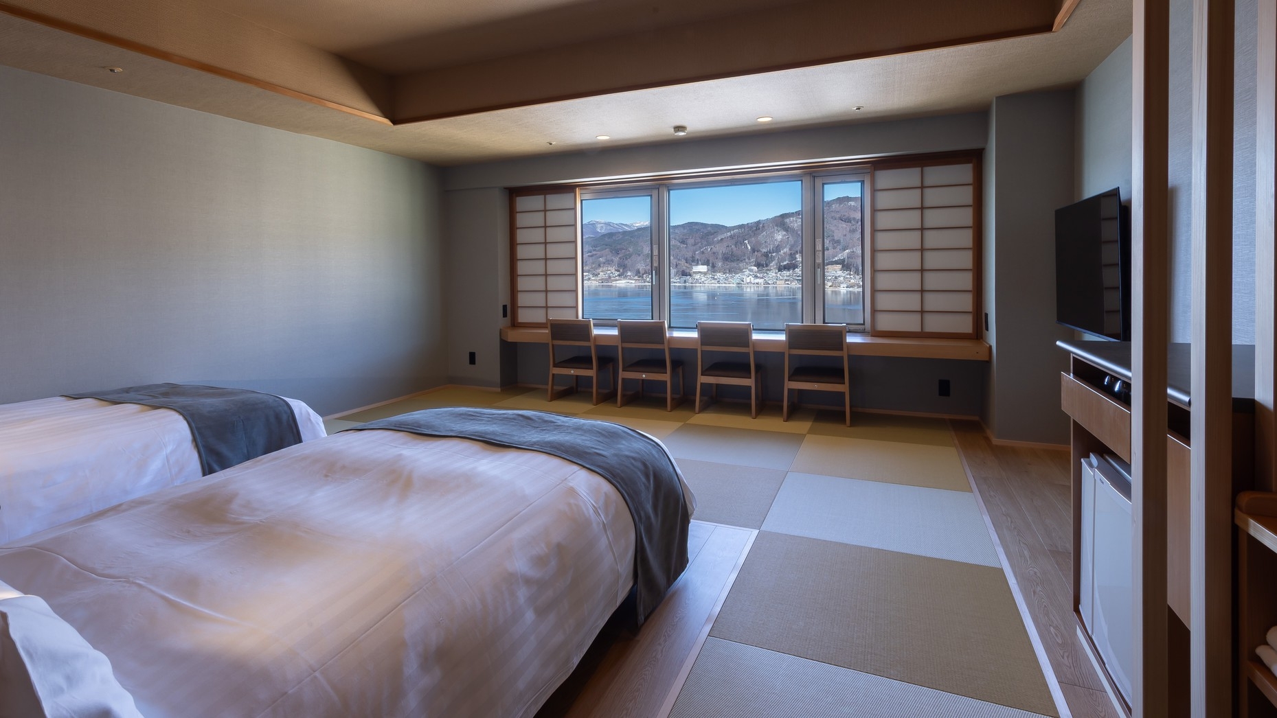 諏訪湖を正面に眺める当館一番人気の客室 ※夏季花火は見えません。