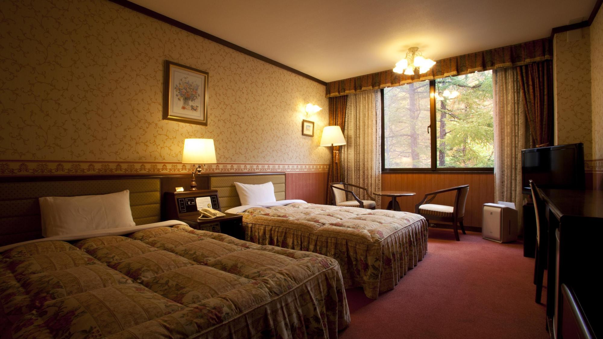 ウッドテラスが付いた上質なデラックスツイン。バス・トイレ付洋室タイプです。ペット用アメニティ完備/ペットとの添い寝可/小型犬、中型犬、大型犬、全ての犬種を歓迎!