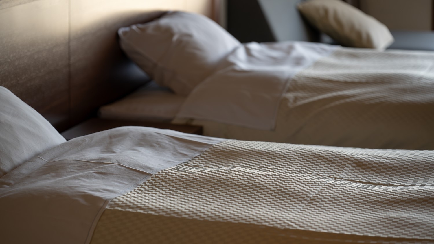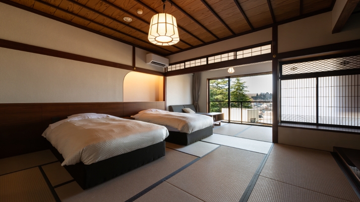2022年11月にリニューアルしたジャパニーズスィートルームです。(全4部屋)ツインベッド付き和洋室で、Serta(サータ)のベットを導入致しました。