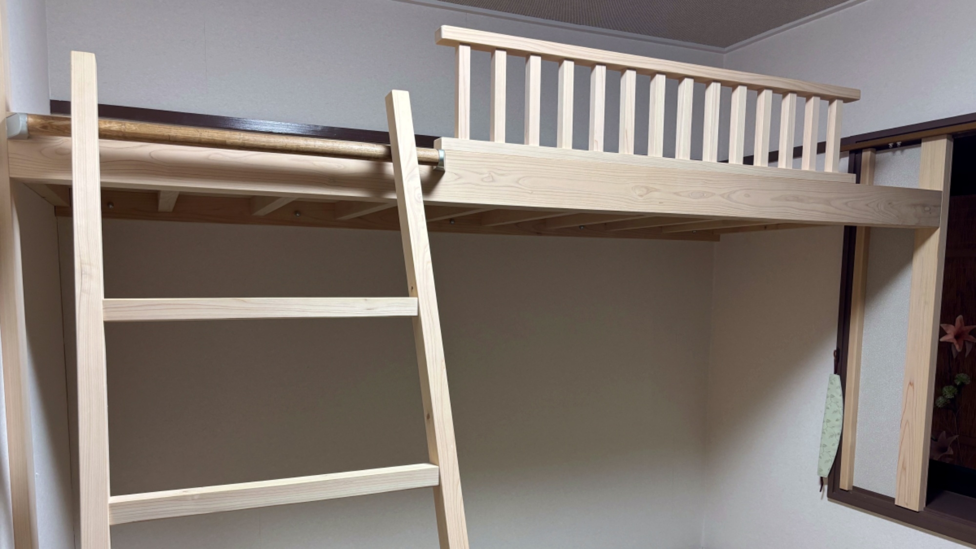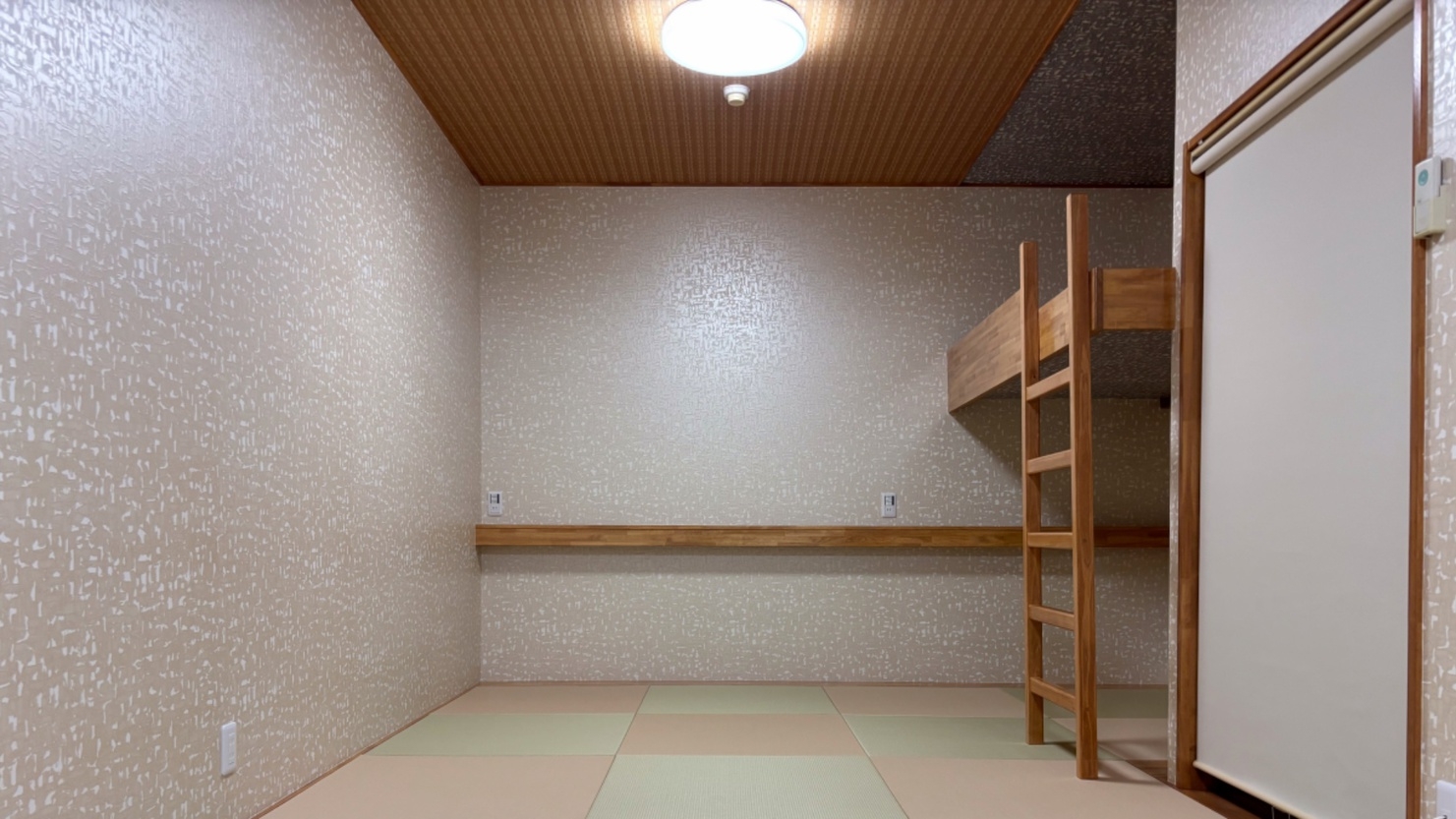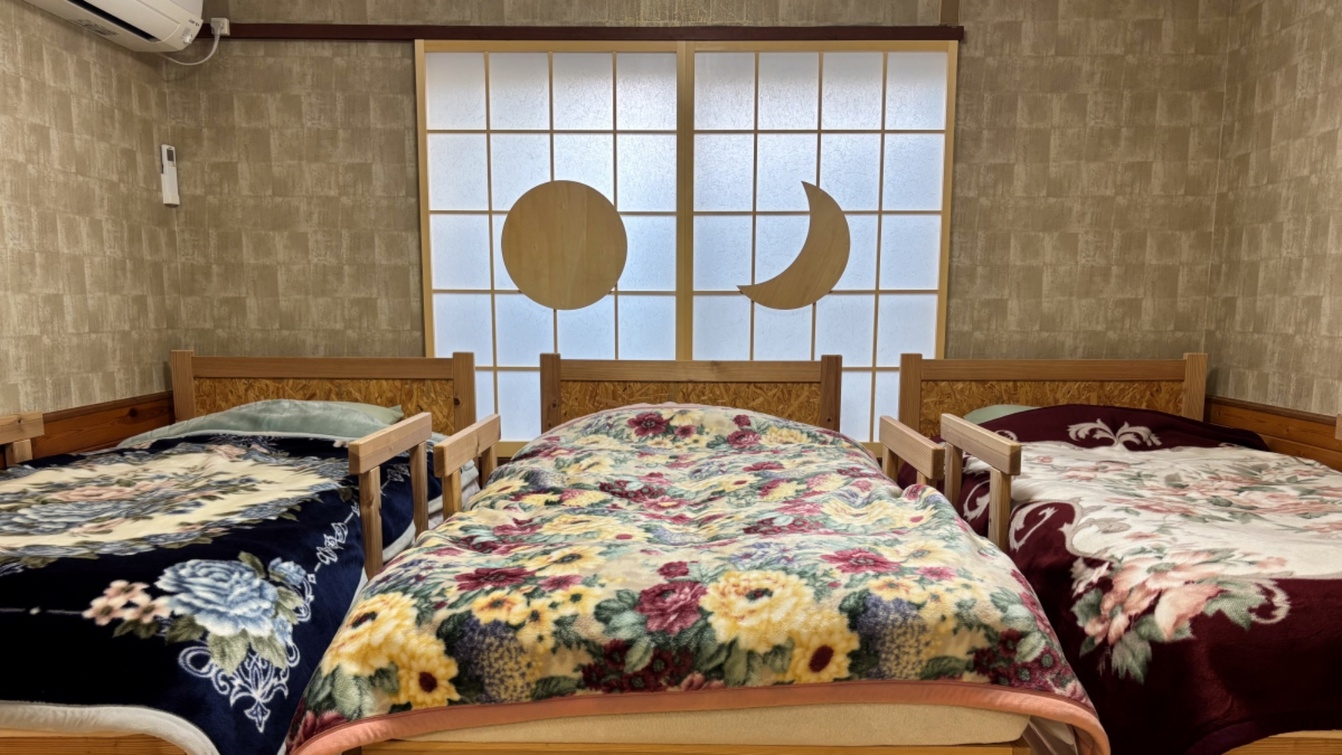 1〜4名で泊まれるロフト付き和室。ダブルマットレス一組(3・4名様にはお布団)。お布団敷きセルフ・洗面所完備 ★2025年4月より料金改定でもっとお得に♪