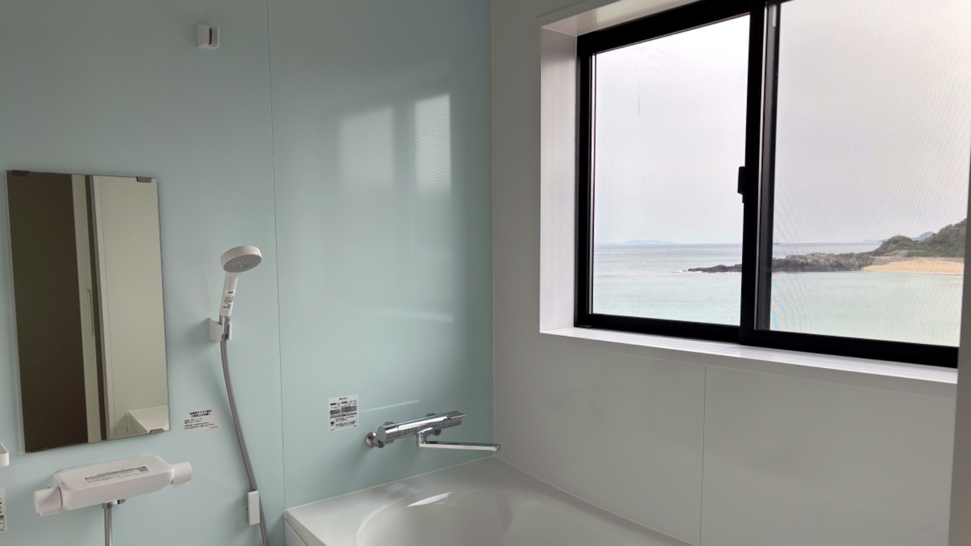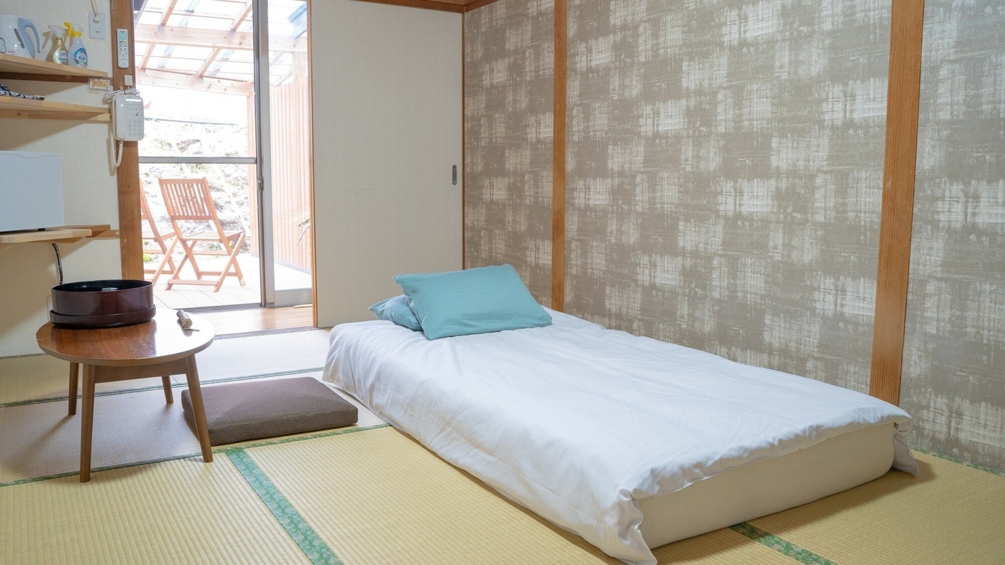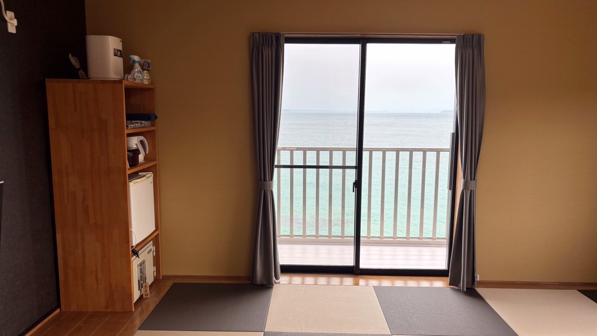 玄界灘の雄大な眺めを一望できる和室です。2〜5名利用。洗面所完備※お布団敷きセルフ