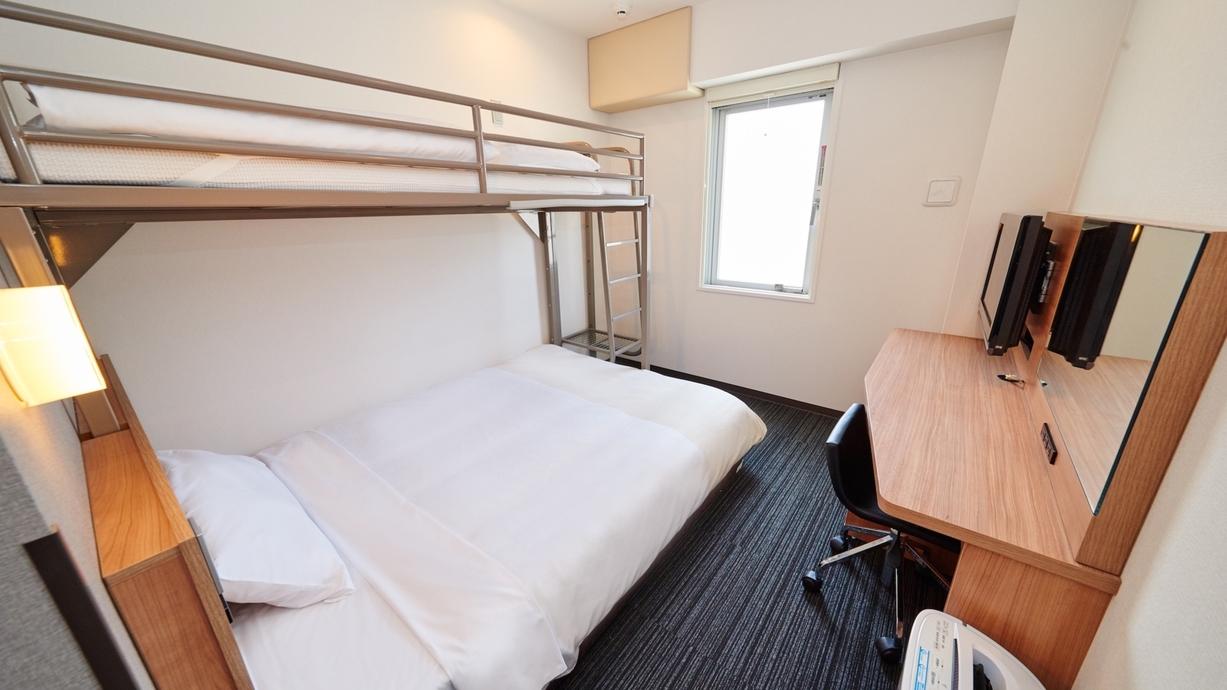 【客室設備】140cm幅ダブルベッド+ロフトベッド、FreeWiFi、32型液晶TV、加湿付空気清浄機、静音型冷蔵庫、ケトル、ドライヤー、ユニットバスなど